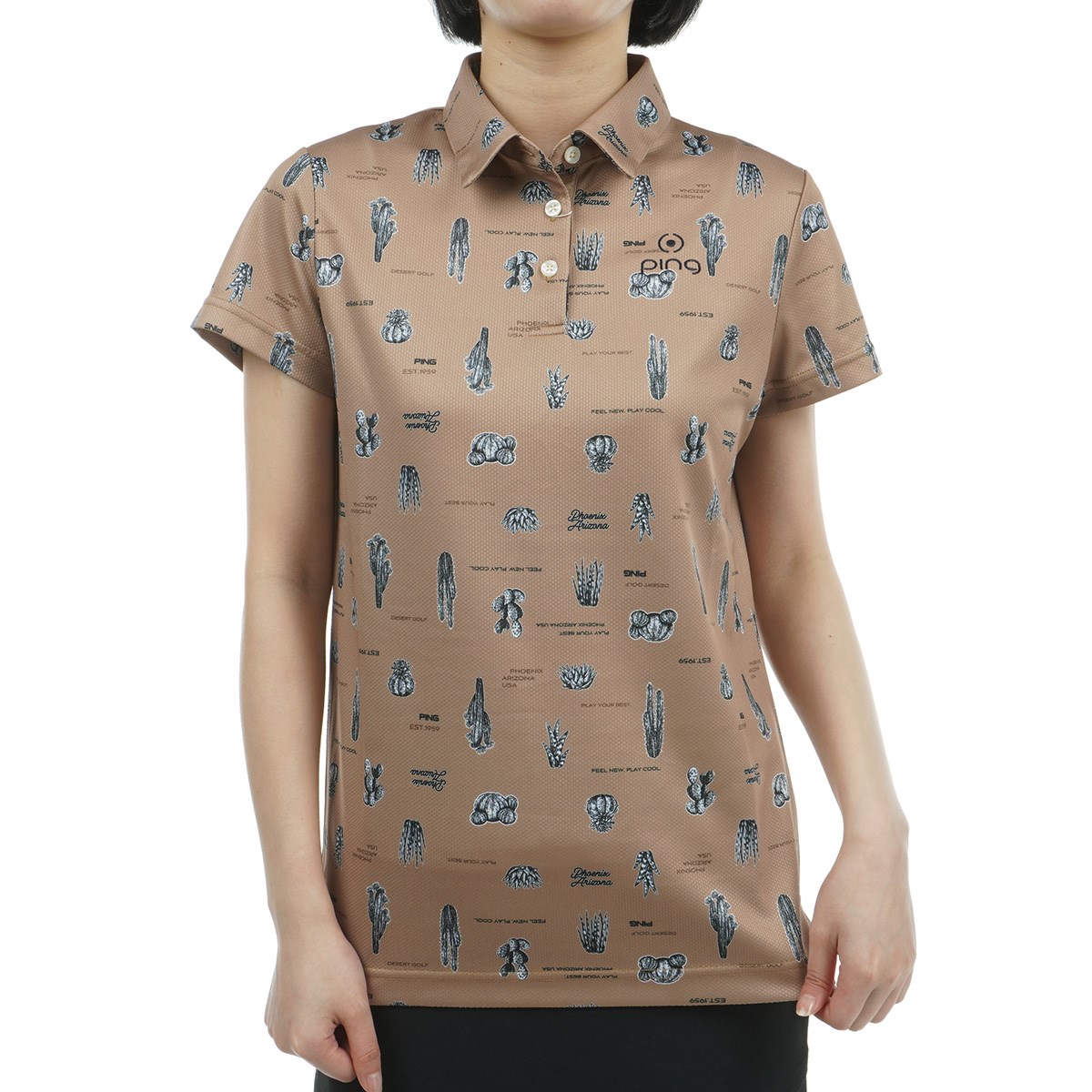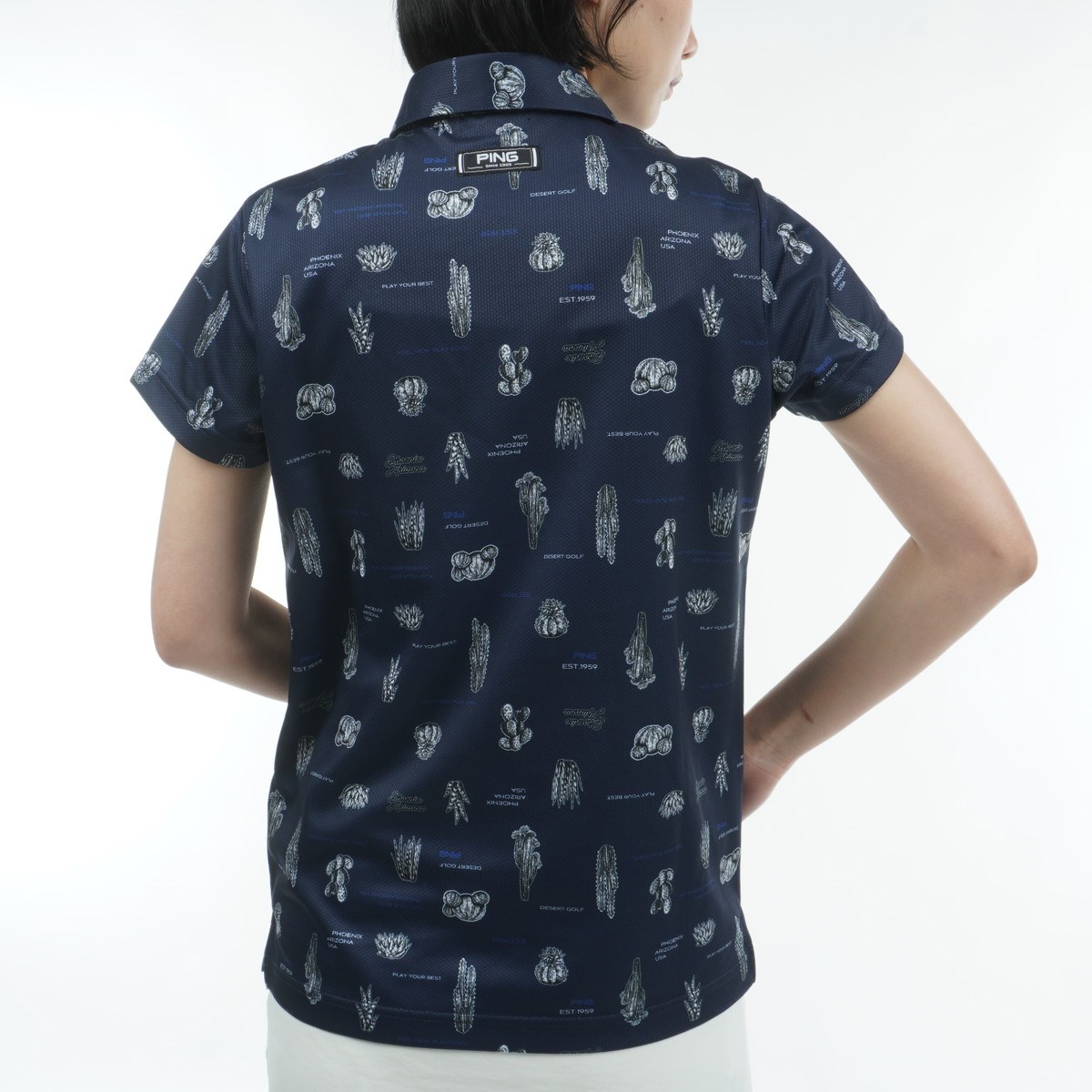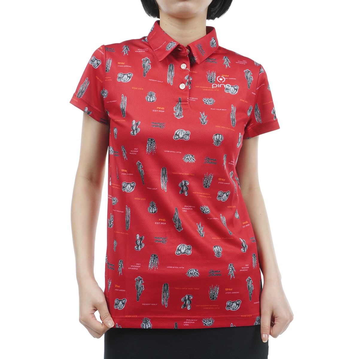 PINGの発祥地であるアリゾナの砂漠に生殖する様々な植物を総柄で表現した、サボテン柄プリント半袖ポロシャツ。カジュアルシャツのような見た目のラフな雰囲気からも、ゴルフに限らずアウトドアやデイリーなど幅広いシーンで着たくなる一着です。素材には吸水速乾素材のクイックドライを採用しているので、不快な汗などによる纏わりつきやベトつきを抑えたドライタッチで快適な着心地なのも魅力です。