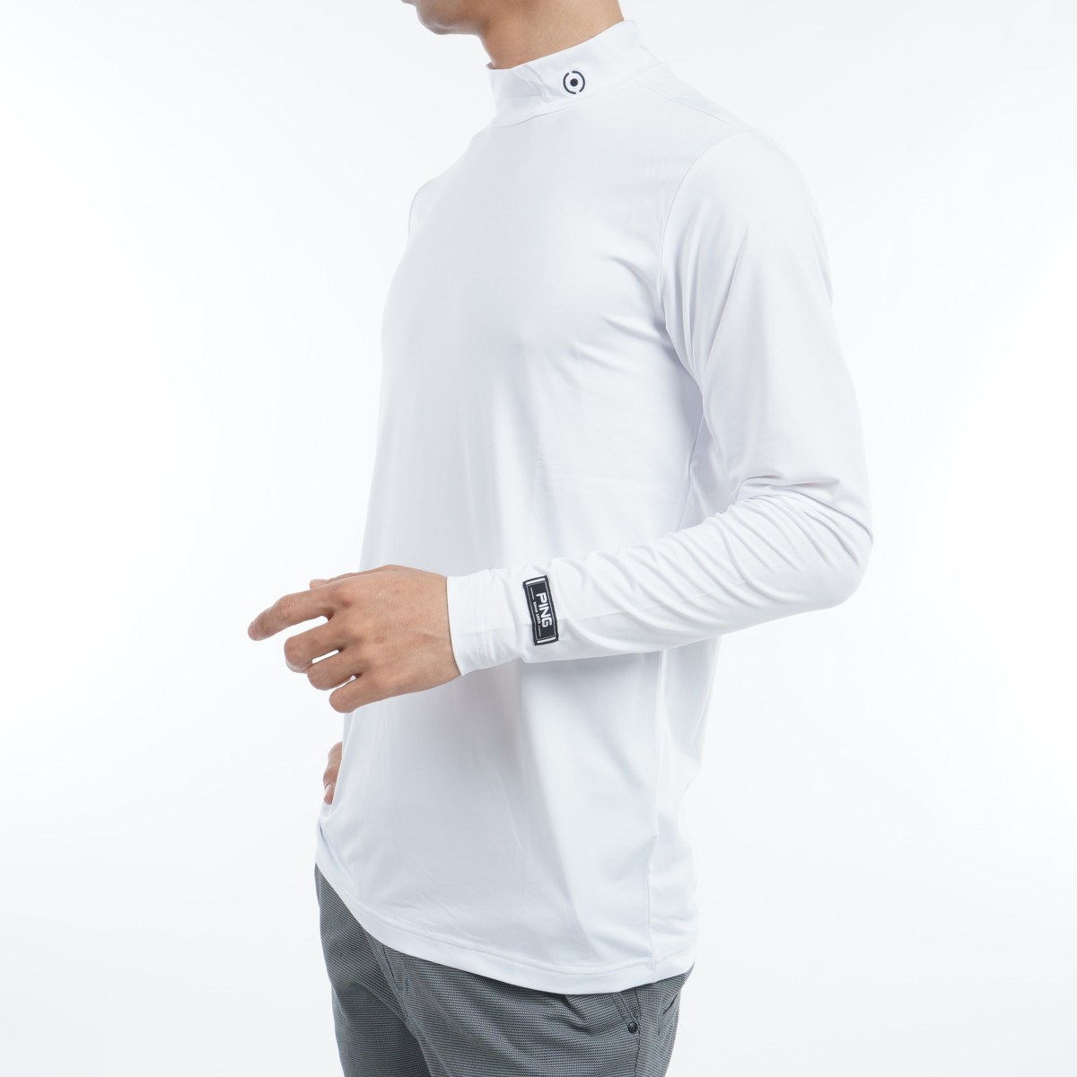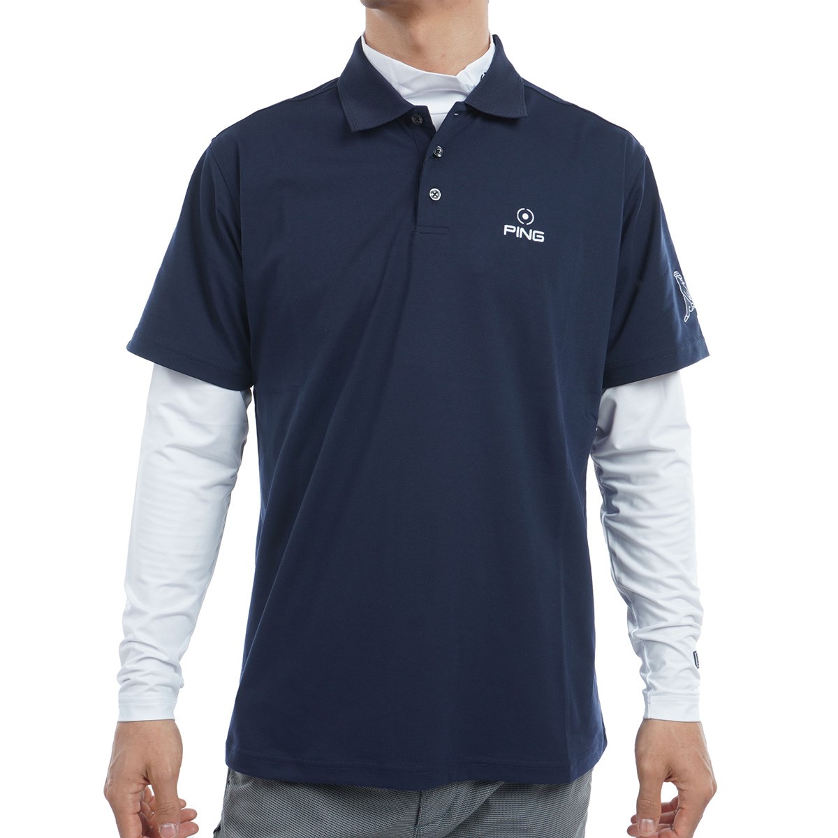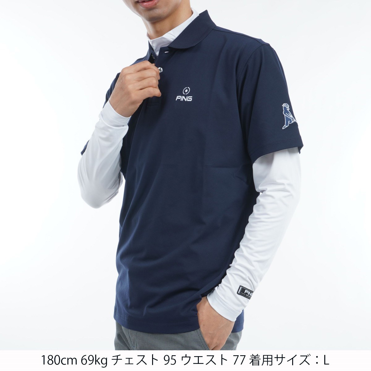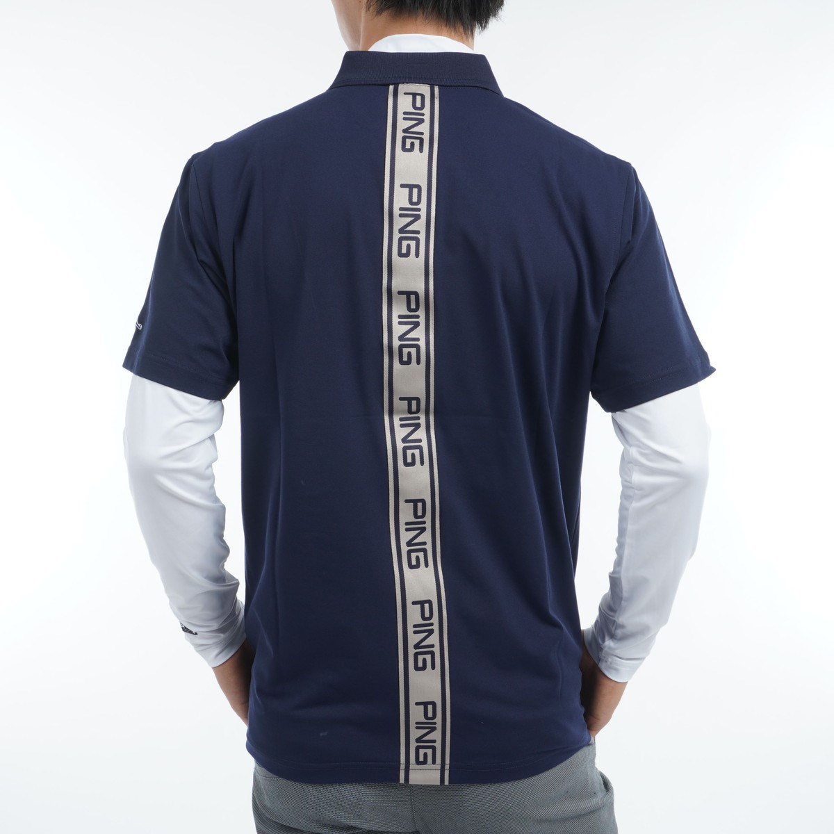PINGのロゴラインでスポーティームードを演出した、ストレッチカノコ×ストレッチ天竺レイヤードツインセット。
