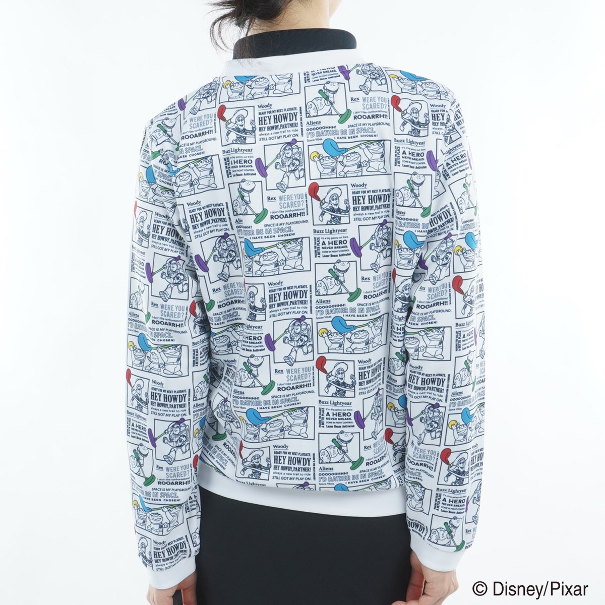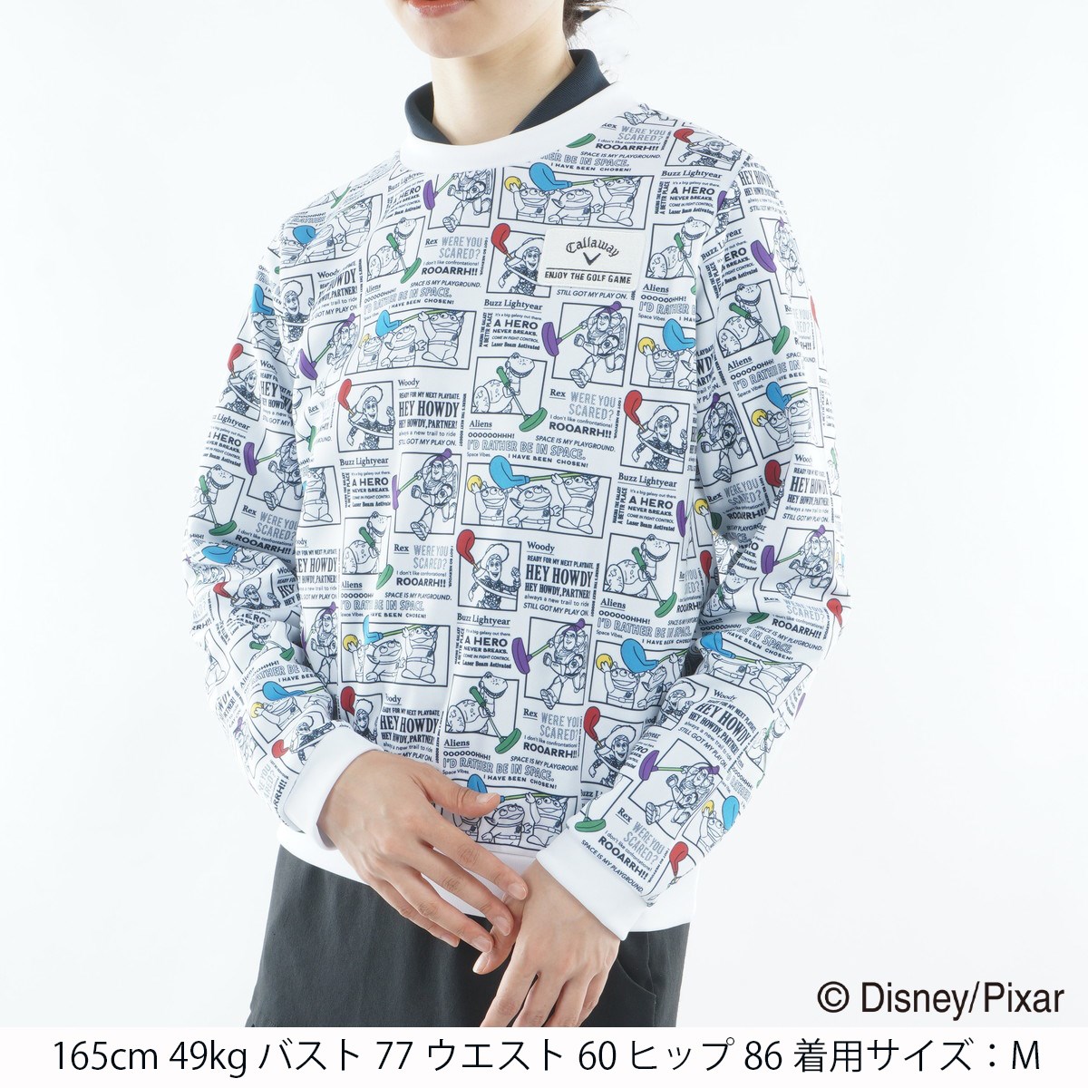 「トイ・ストーリー」のキャラクターたちと、ロゴを組み合わせた柄に、キャロウェイロゴと「ENJOY THE GOLF GAME」のオリジナルワッペンを左胸に施しています。