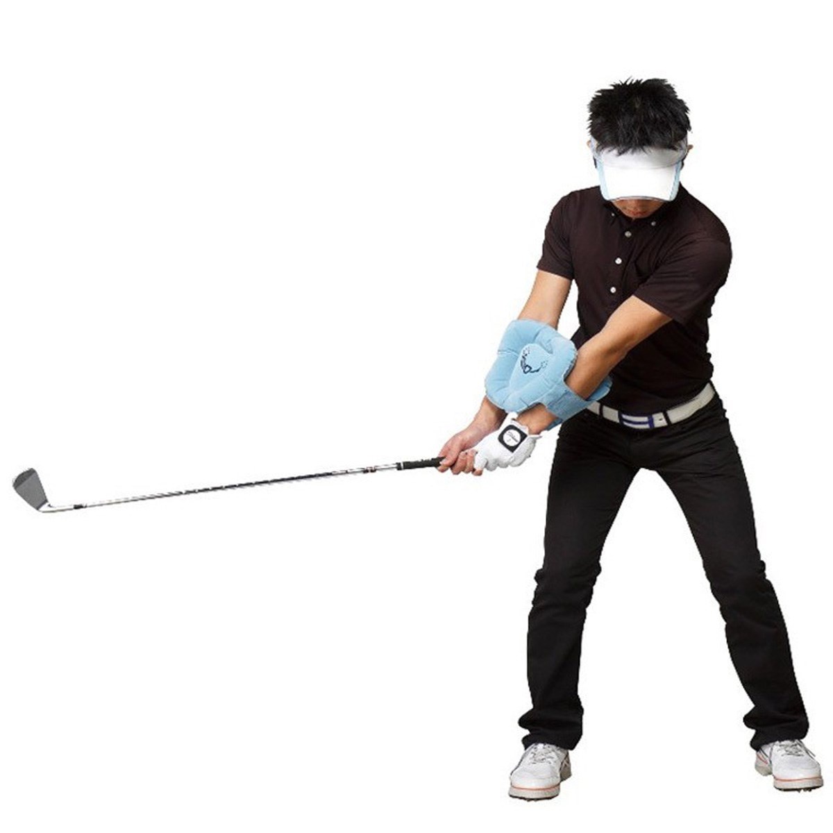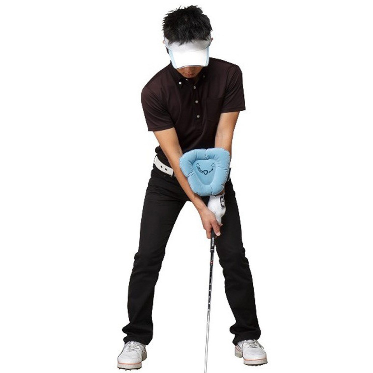 三角先生を空気で膨らませた後、腕に装着して挟みながらスイング練習、アプローチショット練習、パター練習など、腕の三角を崩さないように、キープしながらスイングします。