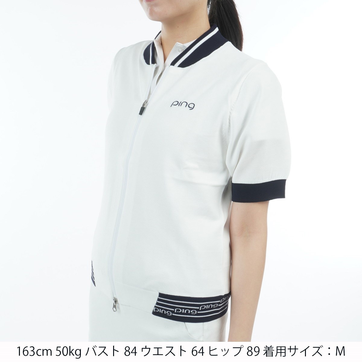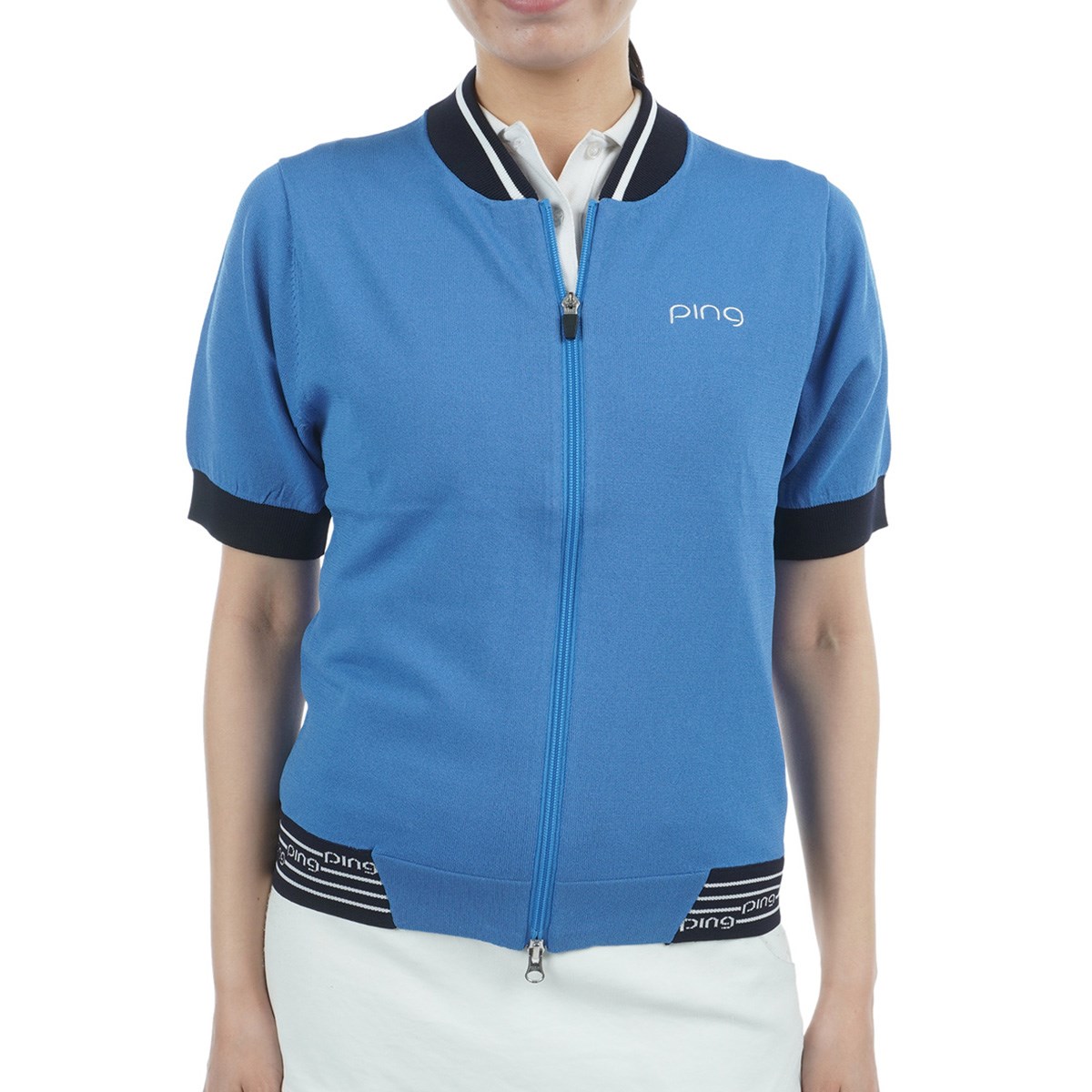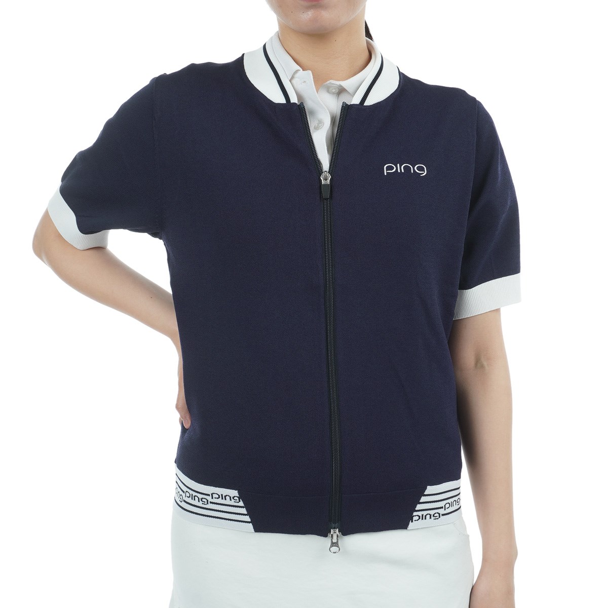 pingのロゴでバックスタイルにインパクトを与えた、半袖フルジップニットブルゾン。