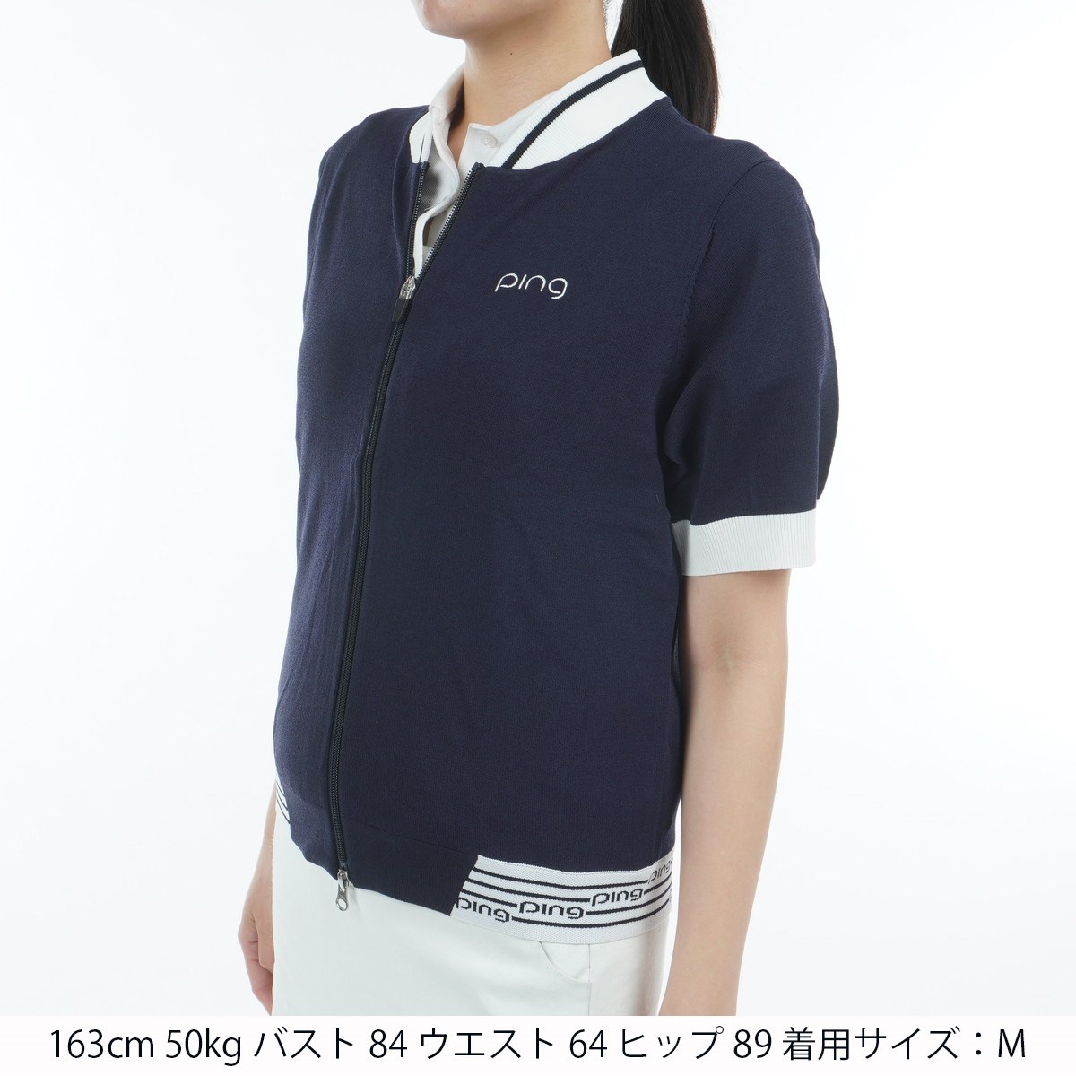 pingのロゴでバックスタイルにインパクトを与えた、半袖フルジップニットブルゾン。襟元、袖、裾をバイカラーのリブで切替したニットブルゾンです。ダブルジップのフロントファスナーの開閉で、表情のあるコーデを楽しめて、こなれ感満載の今っぽい雰囲気に仕上げてくれます。動きやすくレイヤードしやすいシルエットと、ニットならではの伸縮性の良さで快適な着用感を体感できます。普段使いしたくなるようなファッション性の高さも魅力的な、アウトドアやトレーニングにも活用しやすいゴルフに最適なニットブルゾンです。