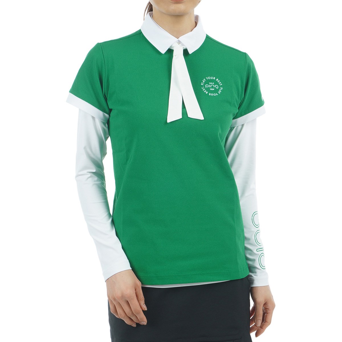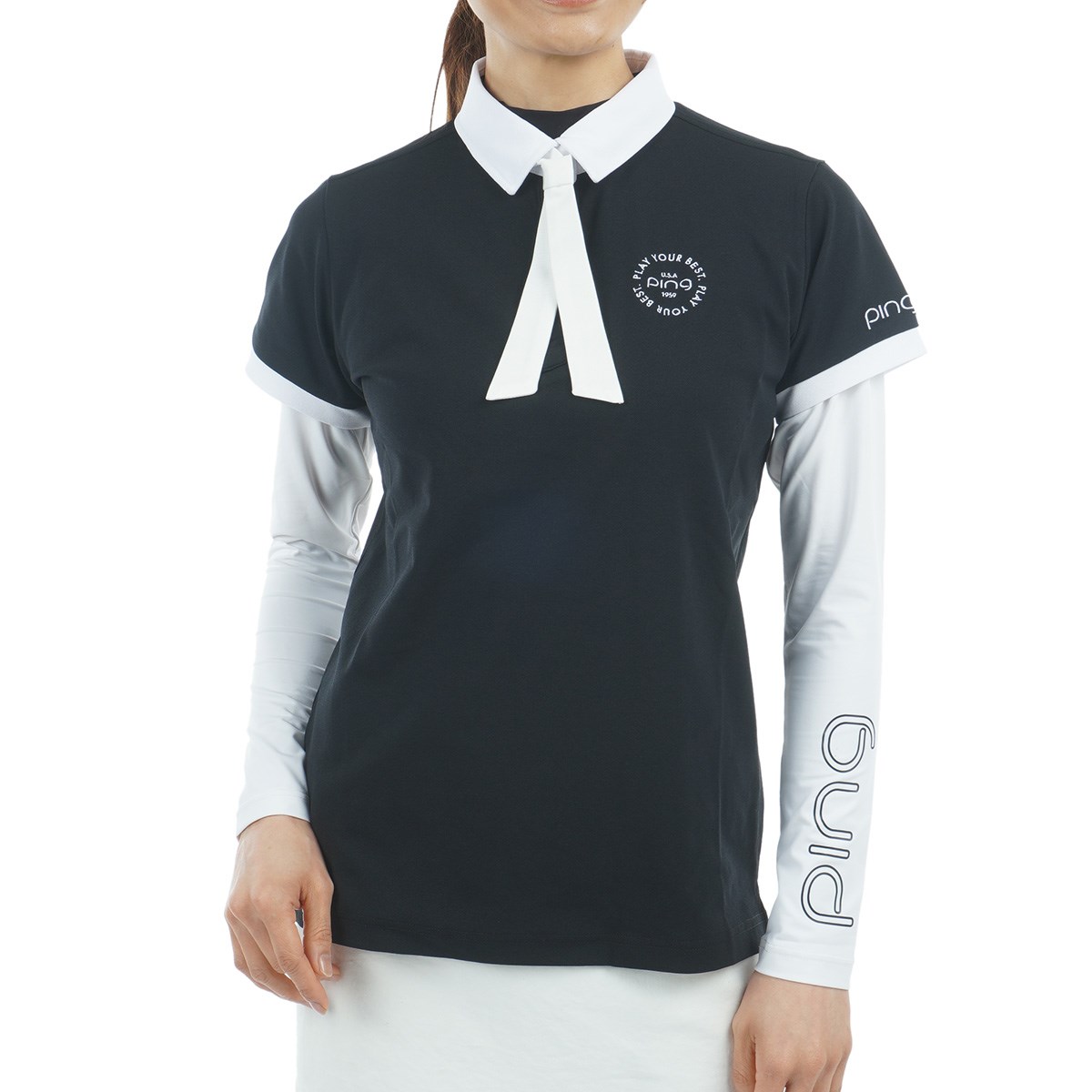 取り外し可能なネクタイ付きのコーデ次第で色々な着方が楽しめる、鹿の子ポロ天竺インナーレイヤードツインセット。