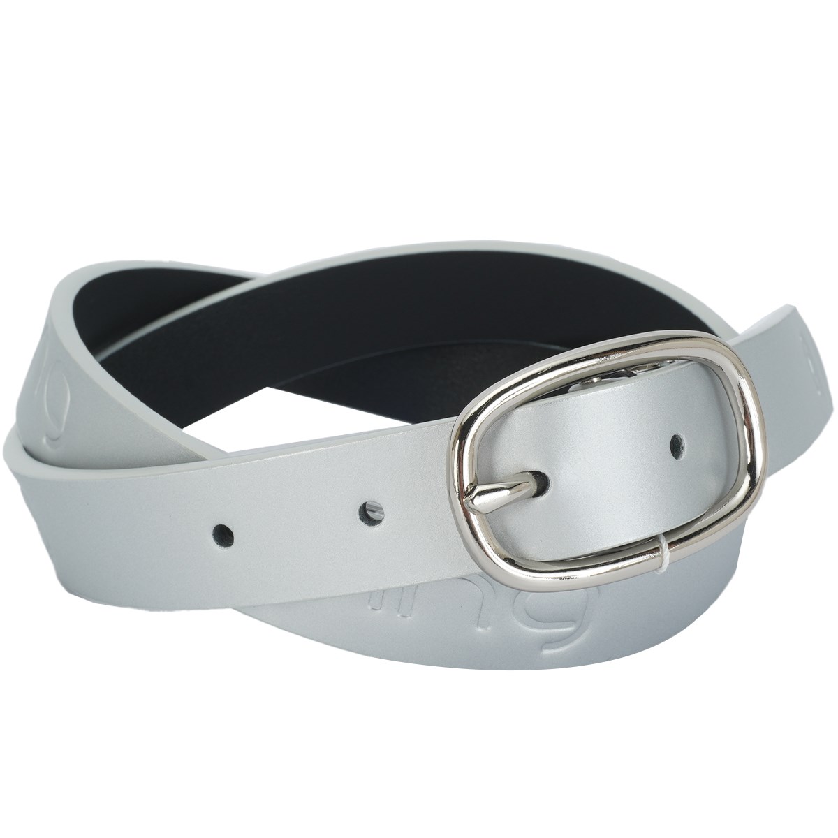 丸みを持たせた美しいフォルムのバックルが優雅な雰囲気の、合成皮革ロゴベルト。