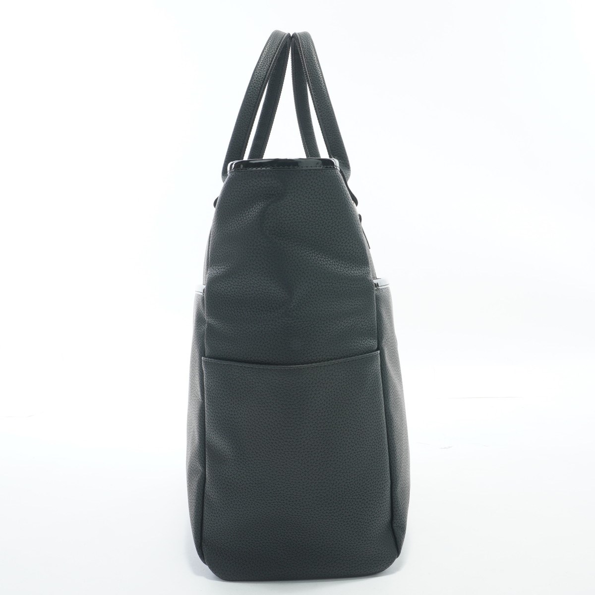深めのエンボスが施された合成皮革と光沢のあるエナメル素材をミックスしたデザイン。