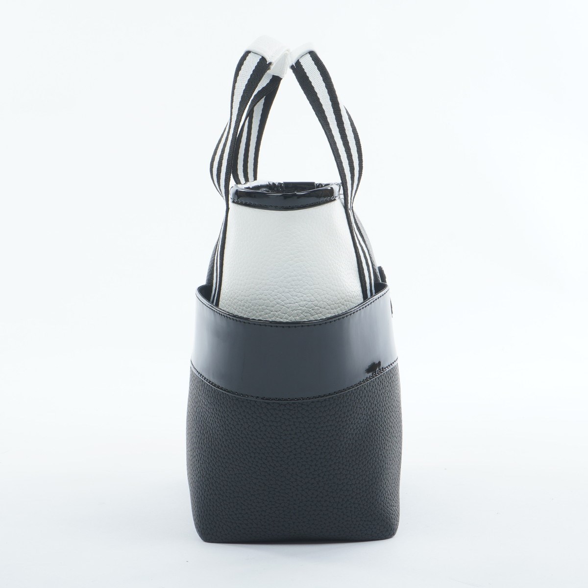 深めのエンボスが施された合成皮革と光沢のあるエナメル素材をミックスしたデザイン。