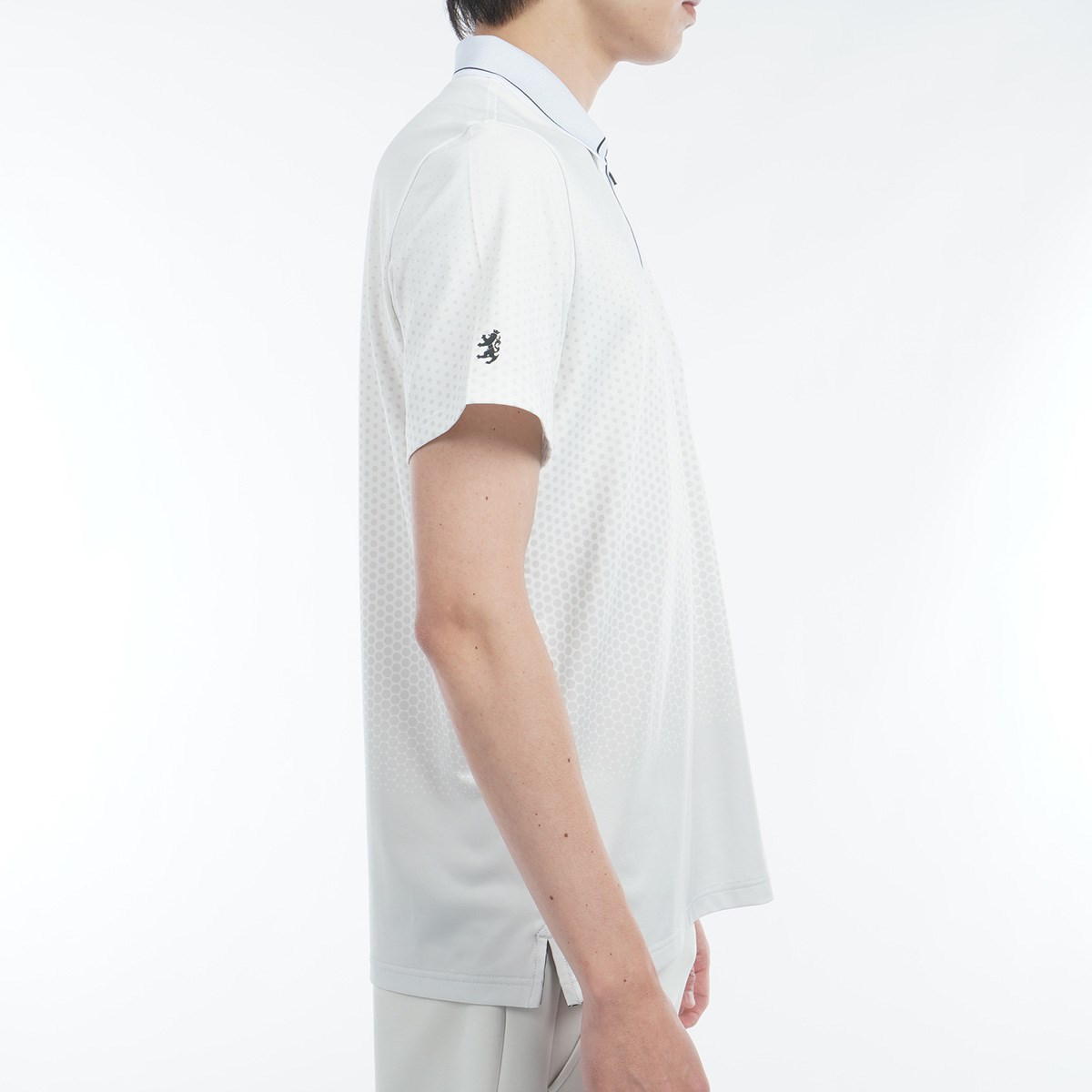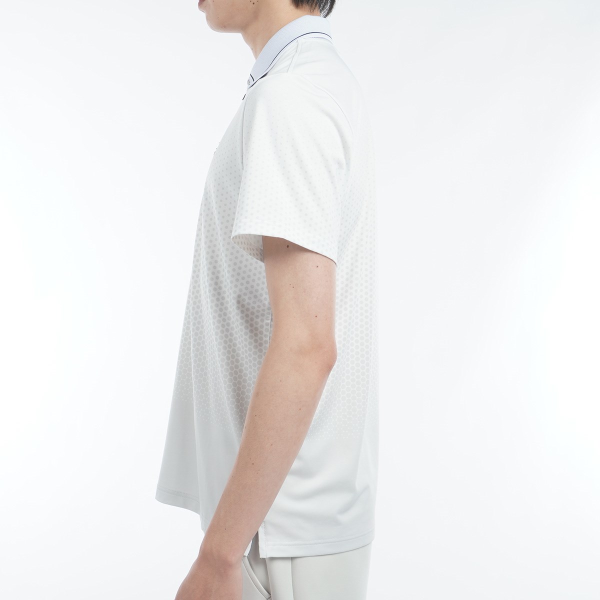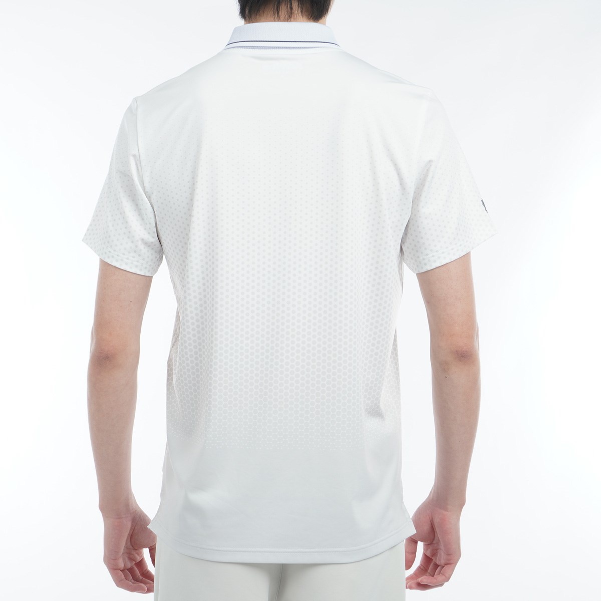 吸水速乾性、UVカット、ストレッチ性に優れたポリエステル天竺素材を使用したドットグラデーション柄がデザインポイントの半袖ポロシャツ。