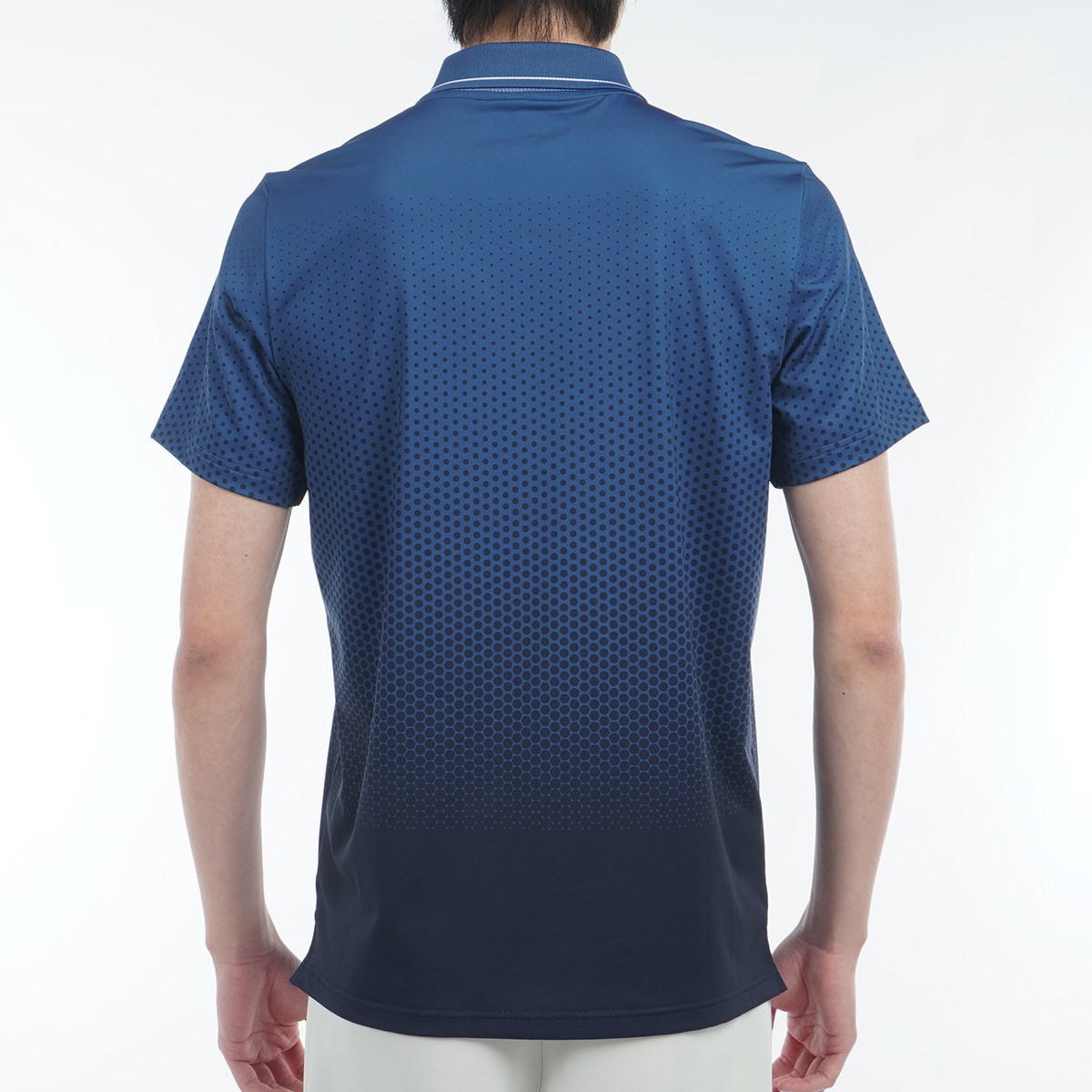吸水速乾性、UVカット、ストレッチ性に優れたポリエステル天竺素材を使用したドットグラデーション柄がデザインポイントの半袖ポロシャツ。