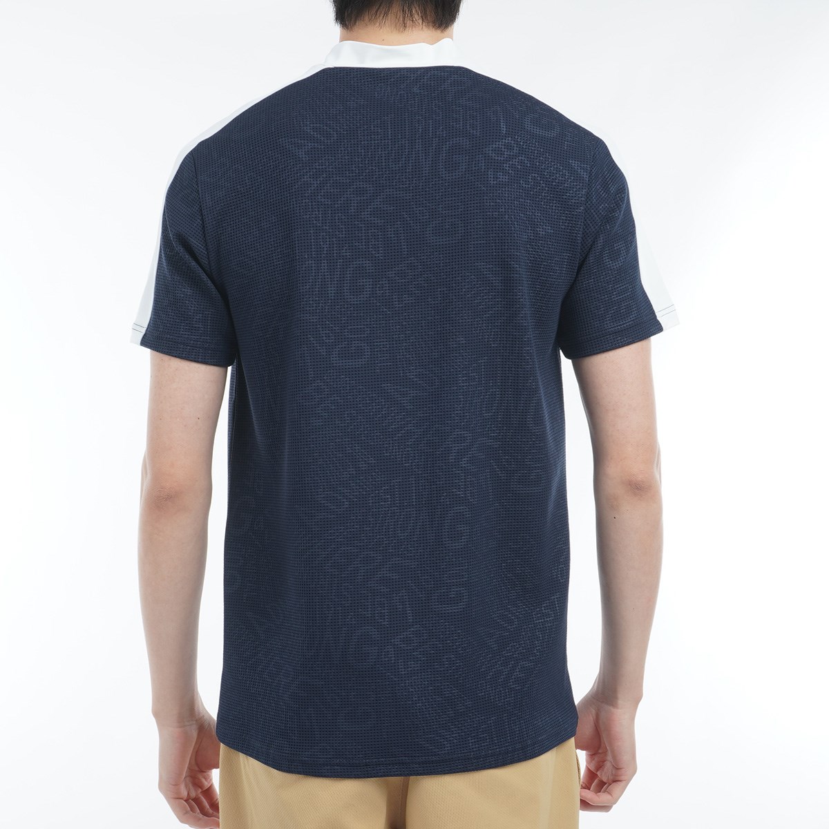 裏面にナイロンを使用した2層素材で、肌に触れるナイロンの冷感性が特徴の、接触冷感ジオメタリックロゴモックネックシャツ。
