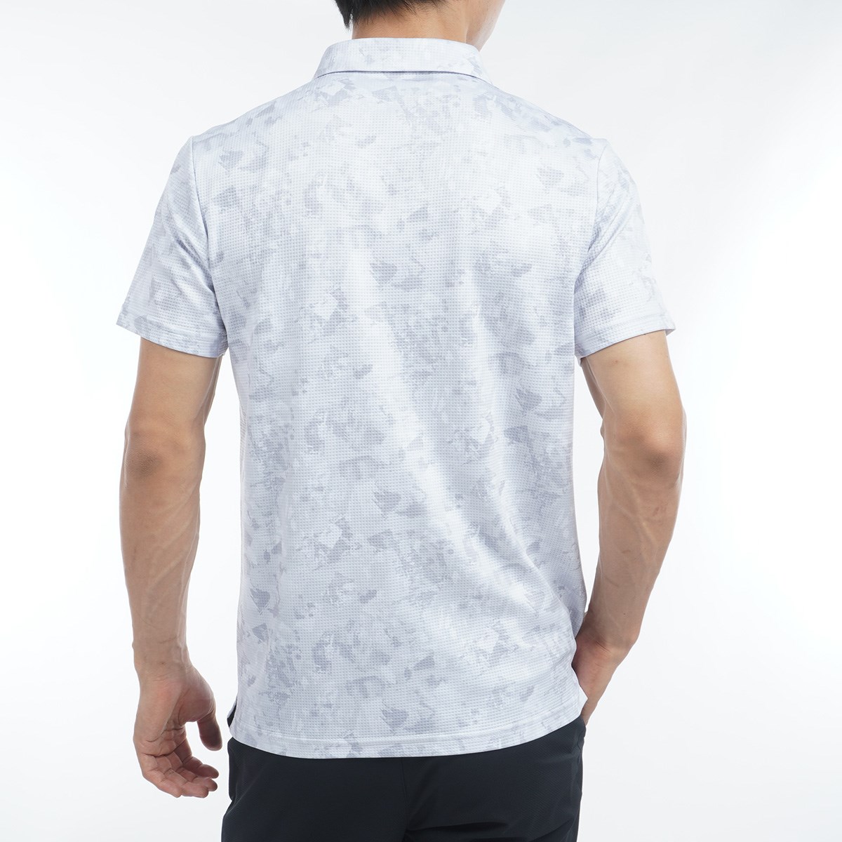 裏面にナイロンを使用した2層素材で、肌に触れるナイロンの冷感性が特徴のローラーカモフラージュプリント半袖ポロシャツ。