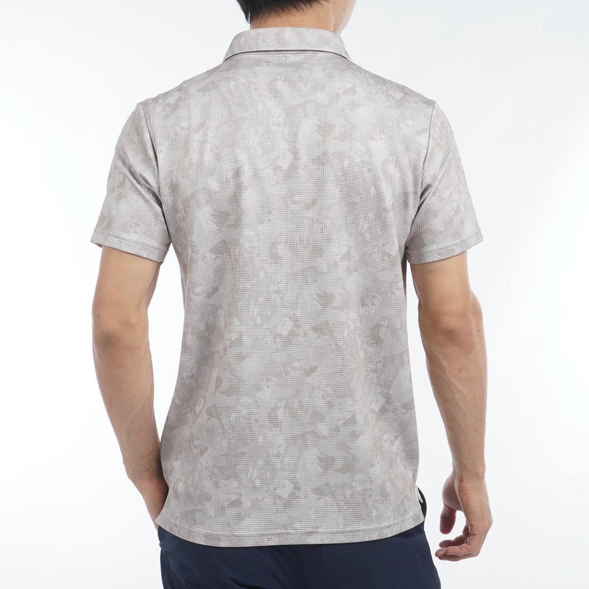 裏面にナイロンを使用した2層素材で、肌に触れるナイロンの冷感性が特徴のローラーカモフラージュプリント半袖ポロシャツ。