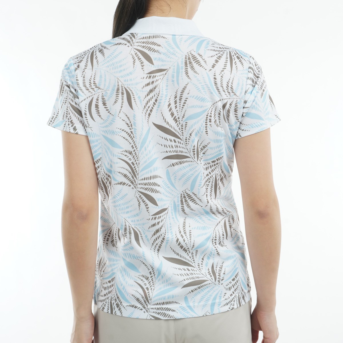 ライトメッシュを使用し、リーフ柄のプリントがリゾート感を演出している半袖ポロシャツ。