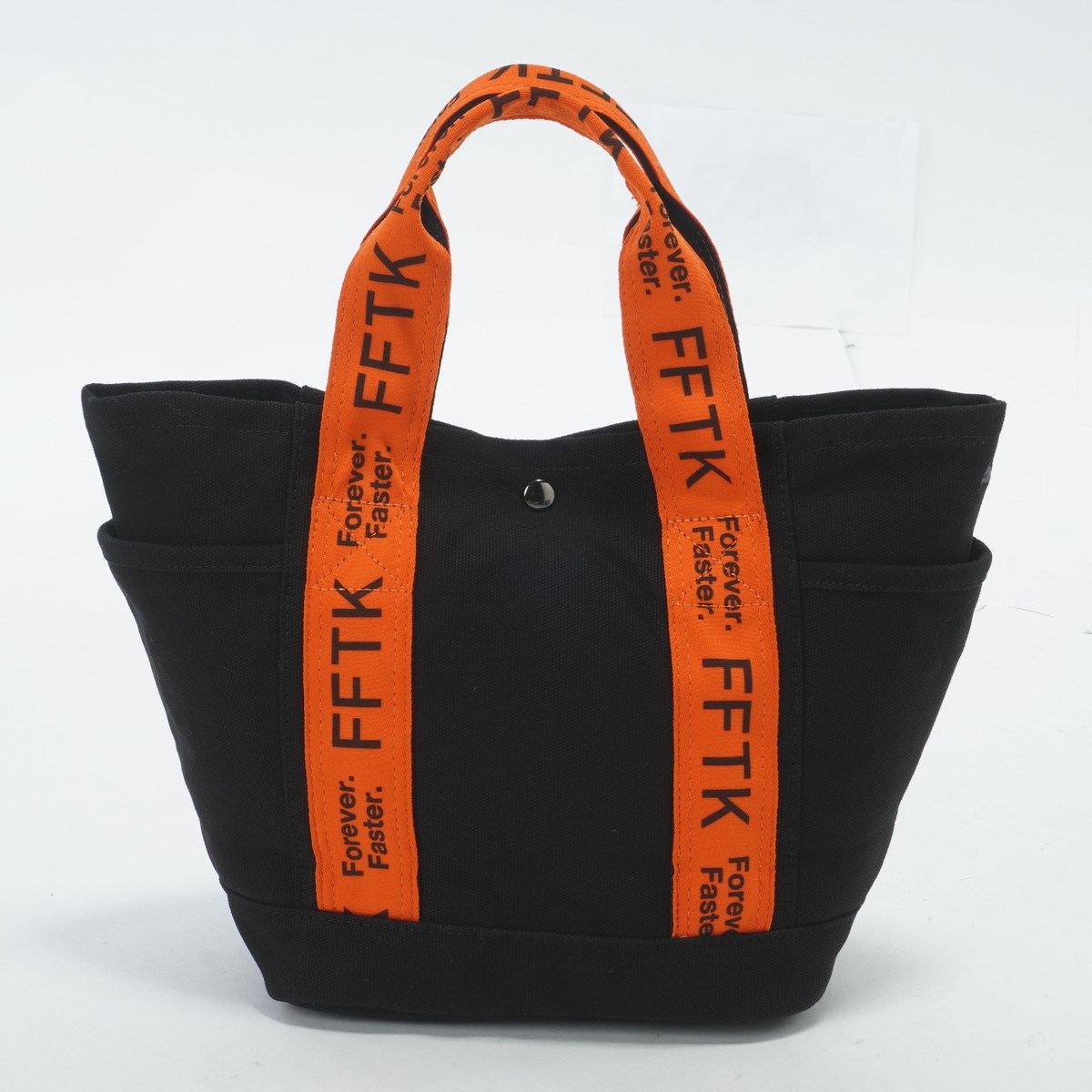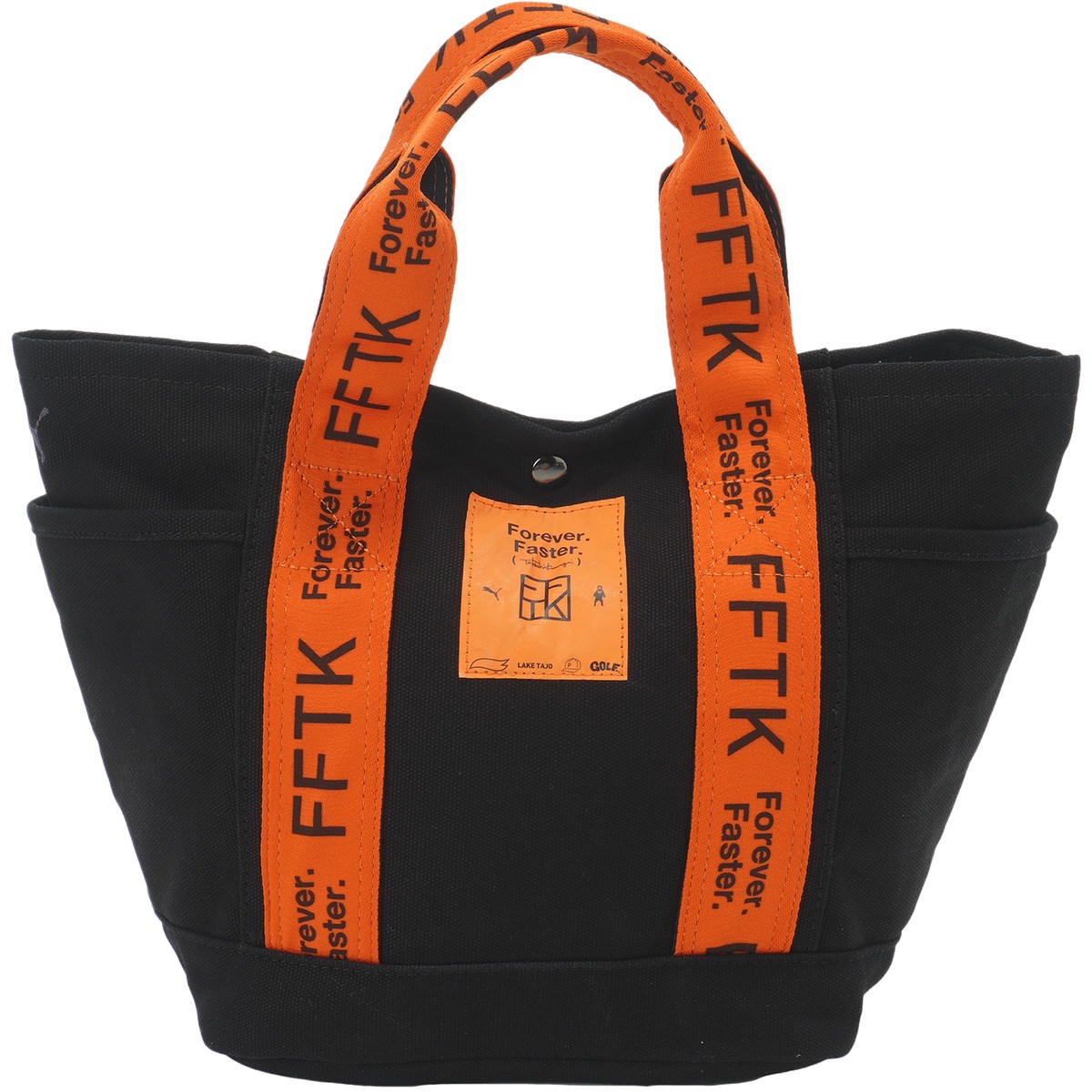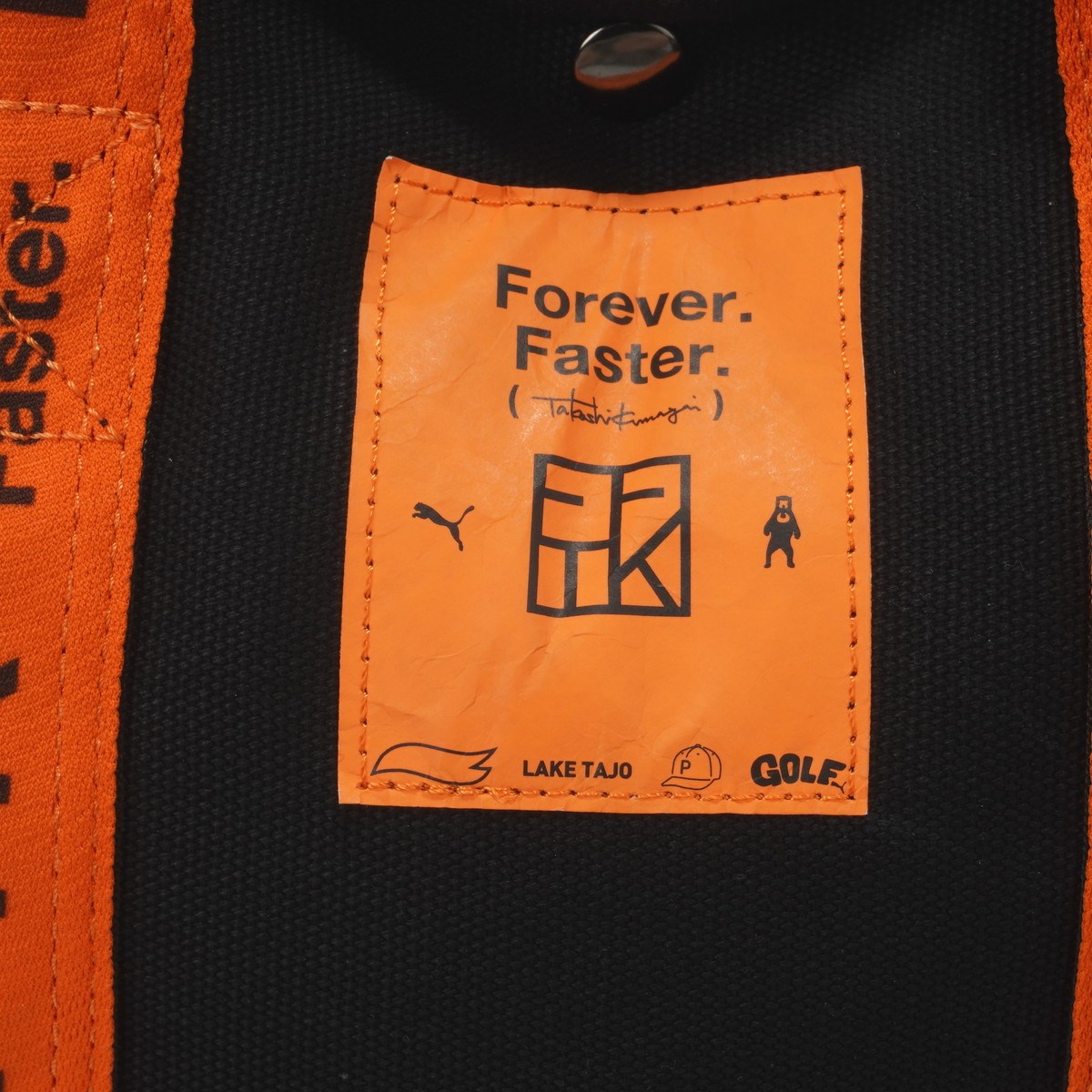 PUMAのスローガンである「FOREVER.FASTER」とスタイリスト熊谷隆志氏のイニシャルをかたどってデザインワークしたFFTKのオリジナルコラボ限定のテープがインパクトあるデザインのラウンドバッグ。