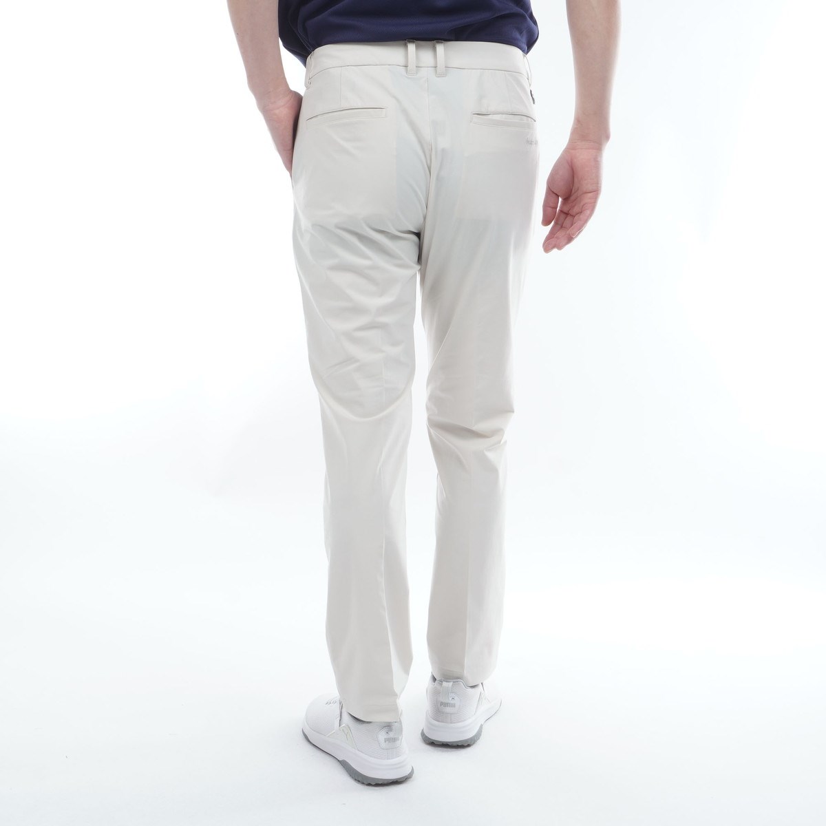 太ももから裾にかけてゆるやかにテーパードを利かせ、過度に細くなりすぎず、けれどすっきりとした見た目の美脚シルエットなパンツに仕上がっています。