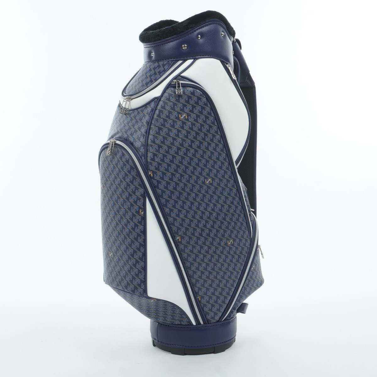 中心にはブランドロゴをあしらい全体的に角を出したデザインの金属パーツが加わることで、キャディバッグの雰囲気がグッと引き締まり、一気に高級感がアップ致しました。