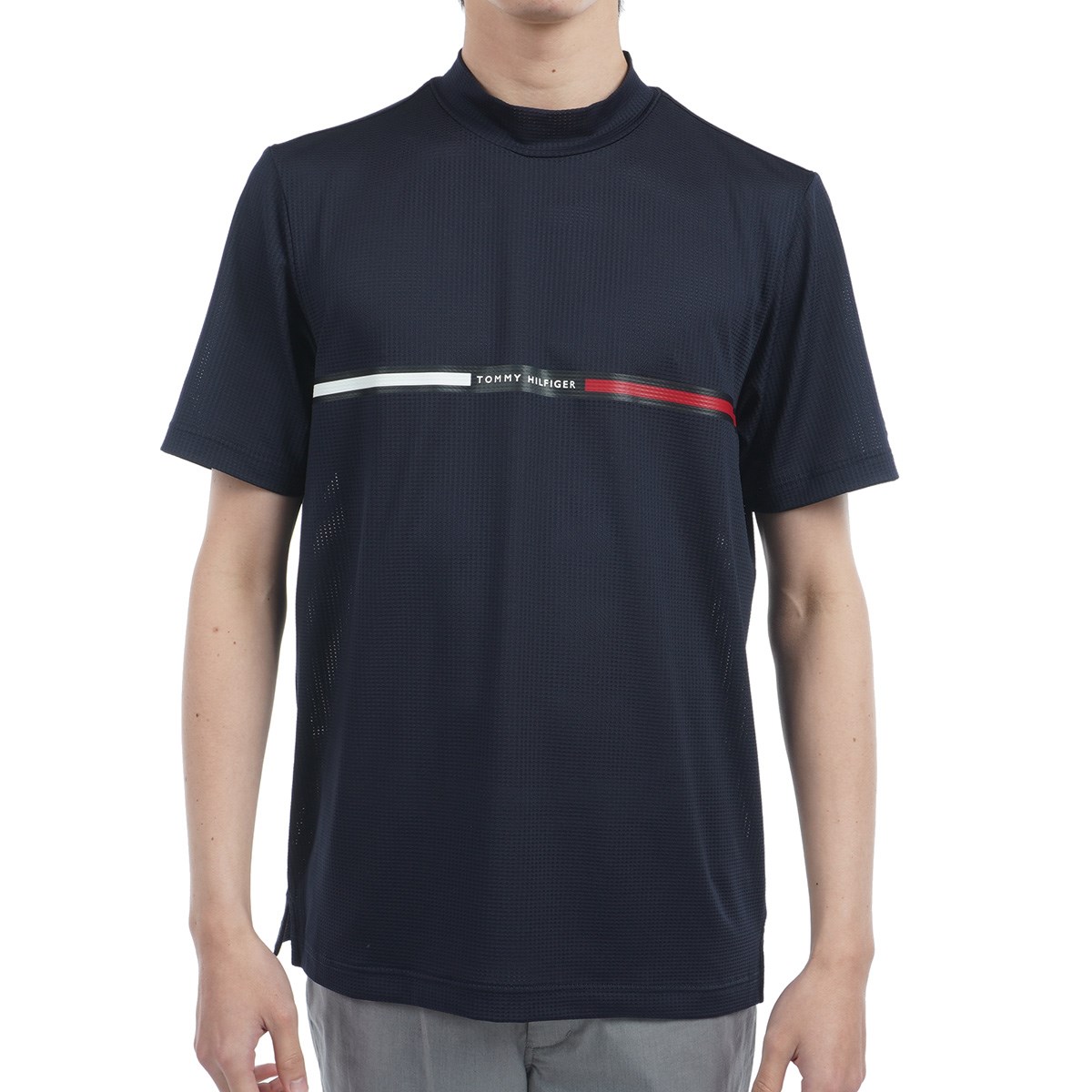 Tシャツ感覚で着られるモックネックスタイルで、フロントにはトミーヒルフィガーらしいトリコロール配色のラインロゴが施されています。