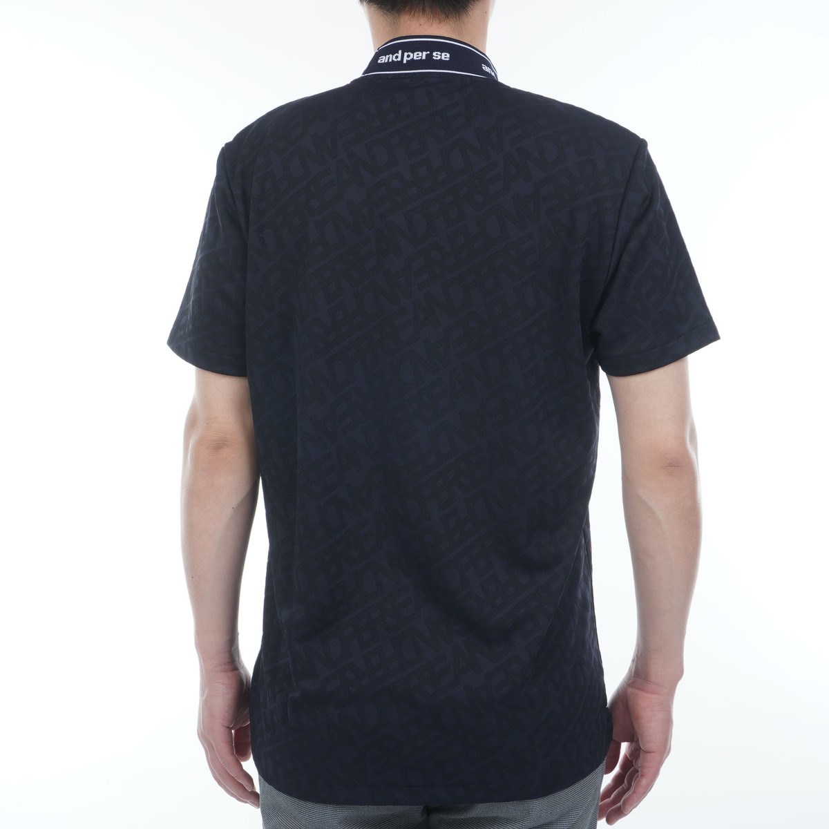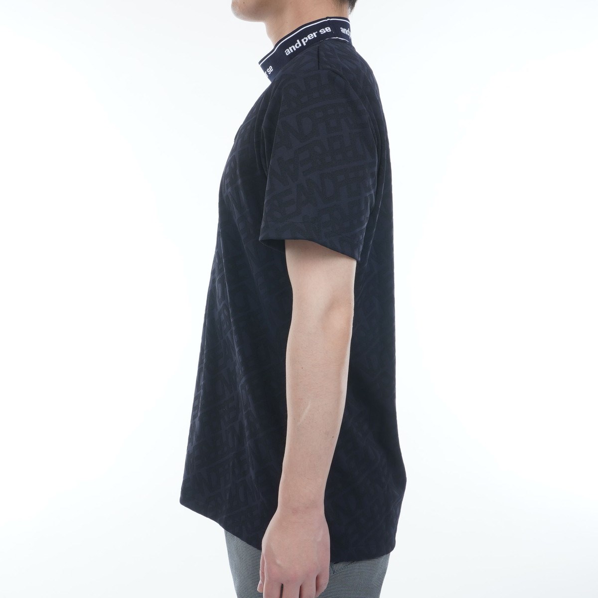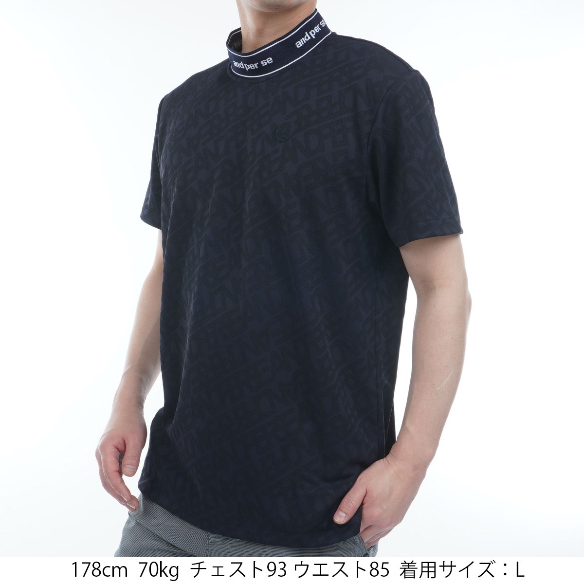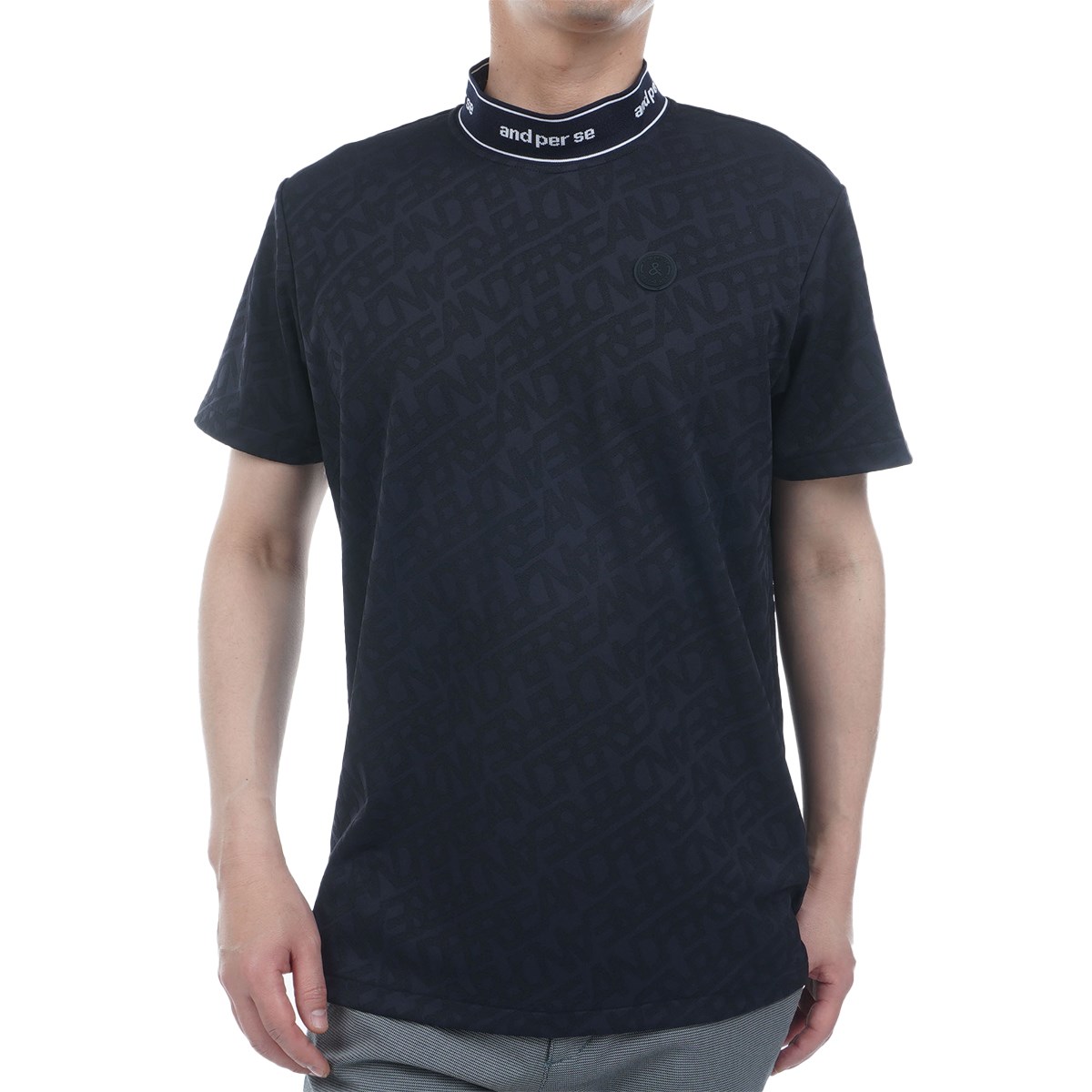 アンパスィ and per se ストレッチ ジャカードスムースモックネック半袖シャツ L ネイビー