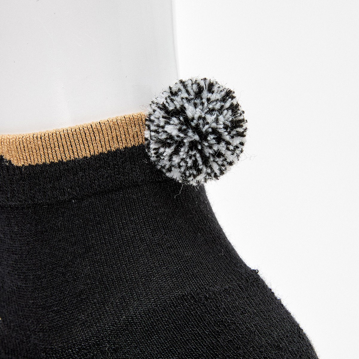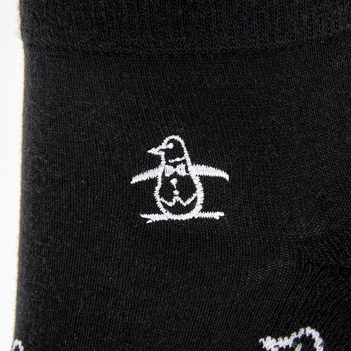 甲部分にペンギン飛び柄が編み込まれた梵天付きアンクルソックス。