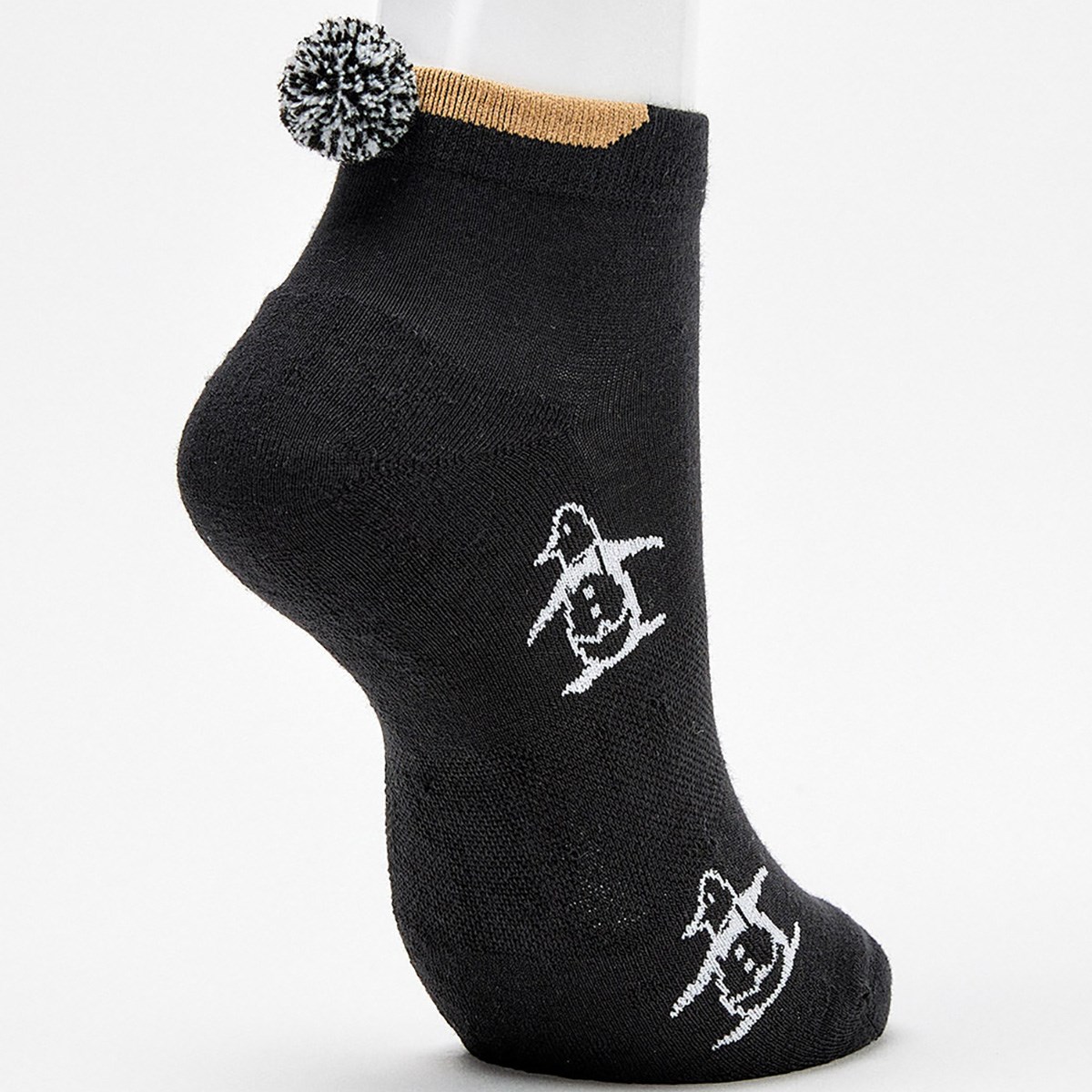 甲部分にペンギン飛び柄が編み込まれた梵天付きアンクルソックス。