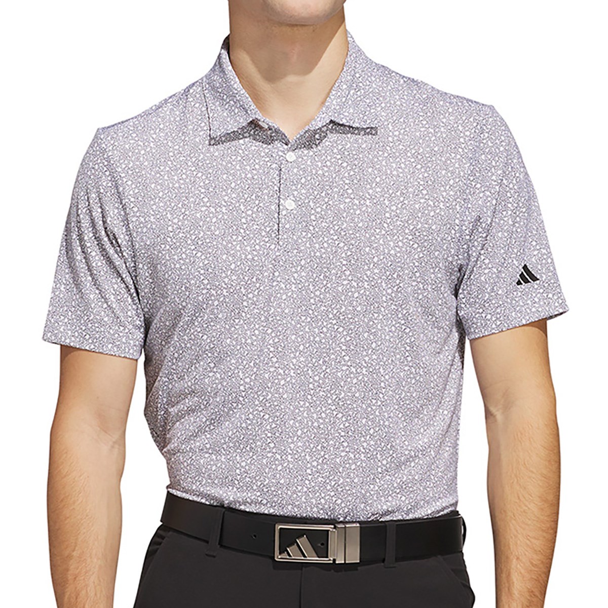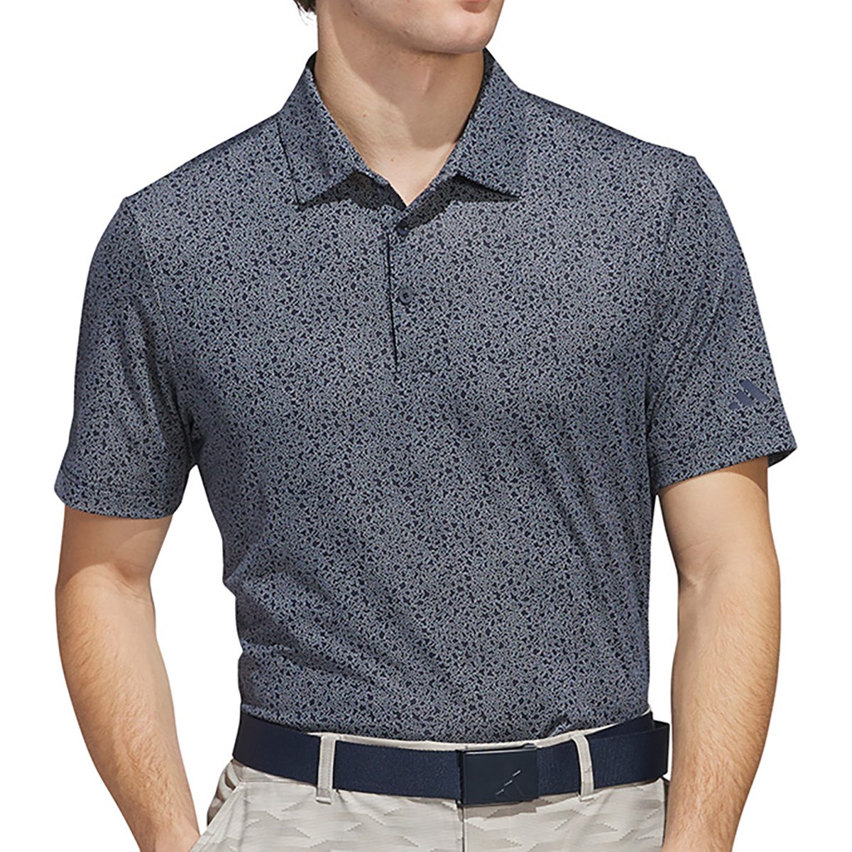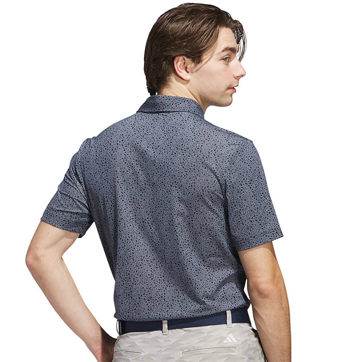 ストレッチ性の高い素材を使用しており、バンカーのような模様が細かくプリントされた半袖ポロシャツ。