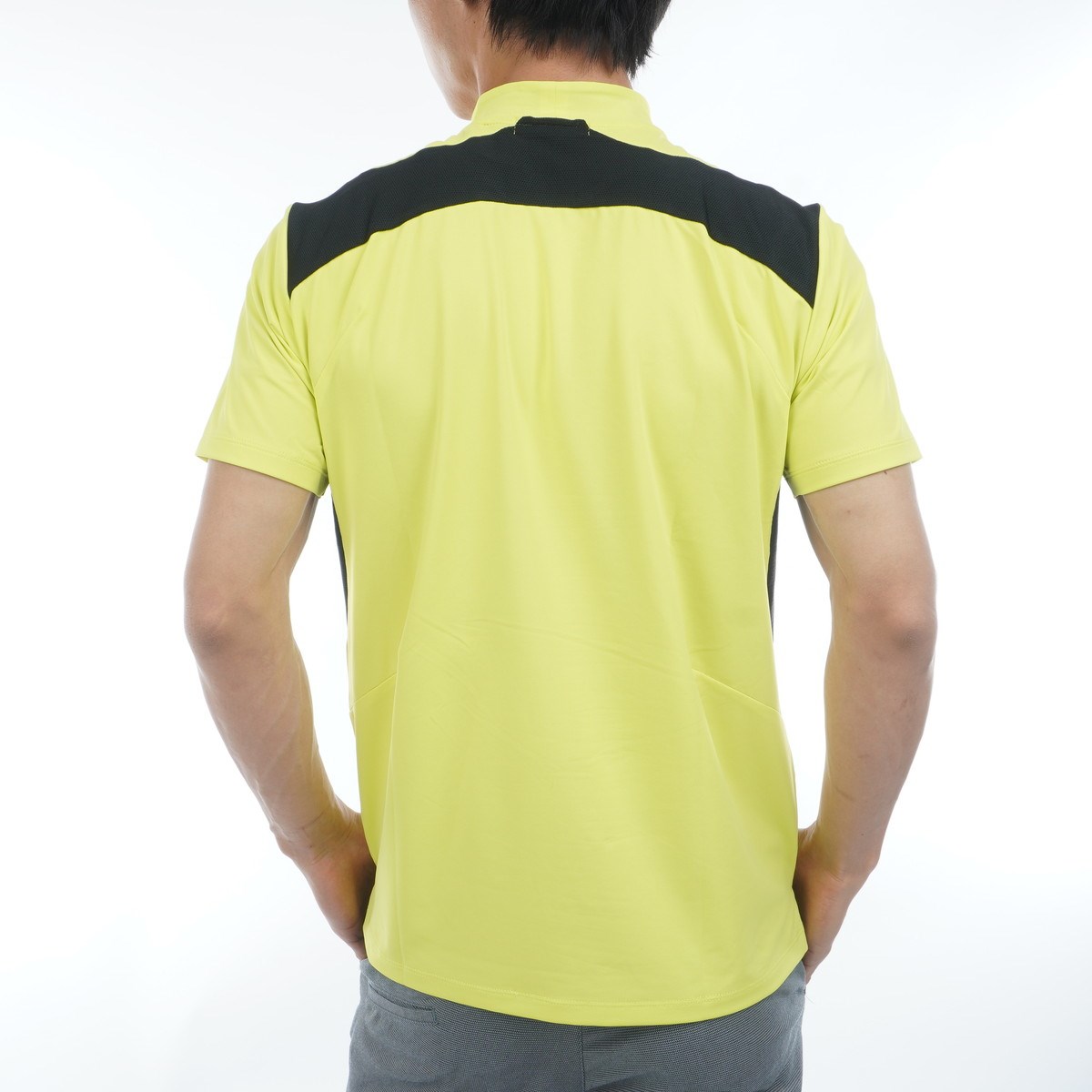 脇と後身頃上部にメッシュ素材を使用し、ストレッチと通気性を考慮しています。