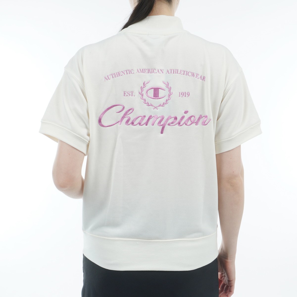 左胸にはCロゴと月桂樹を組み合わせたグラフィックを、背中には左胸と同じグラフィックに、「AUTHENTIC AMERICAN ATHLETICWEAR(オーセンティック アメリカン アスレチックウェア)」、「EST.1919」、筆記体の「Champion(チャンピオン)」を組み合わせて、それぞれ大胆に刺繍しています。