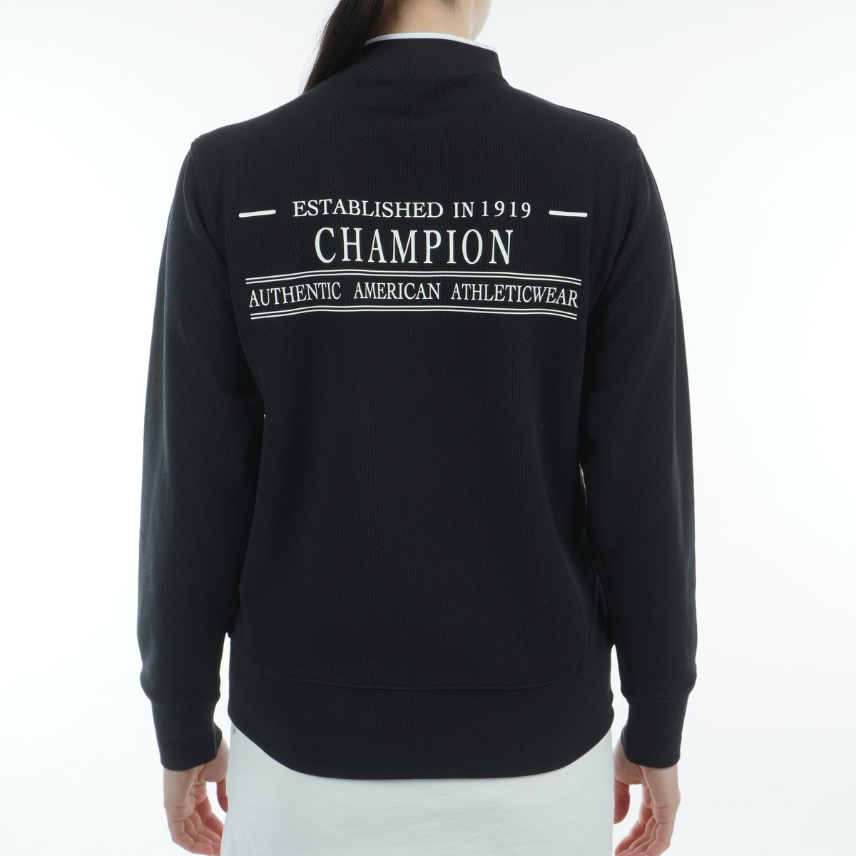 左胸には、襟のラインと同じカラーを使ったChampion®(チャンピオン)ロゴを刺繍し、背中には同様に襟のラインと同じカラーを使って「ESTABLISHED IN 1919(エスタブリッシュド イン 1919)」、「CHAMPION」、「AUTHENTIC AMERICAN ATHLETICWEAR(オーセンティック アメリカン アスレチックウェア)」を組み合わせたグラフィックを大胆にラバープリントで入れています。