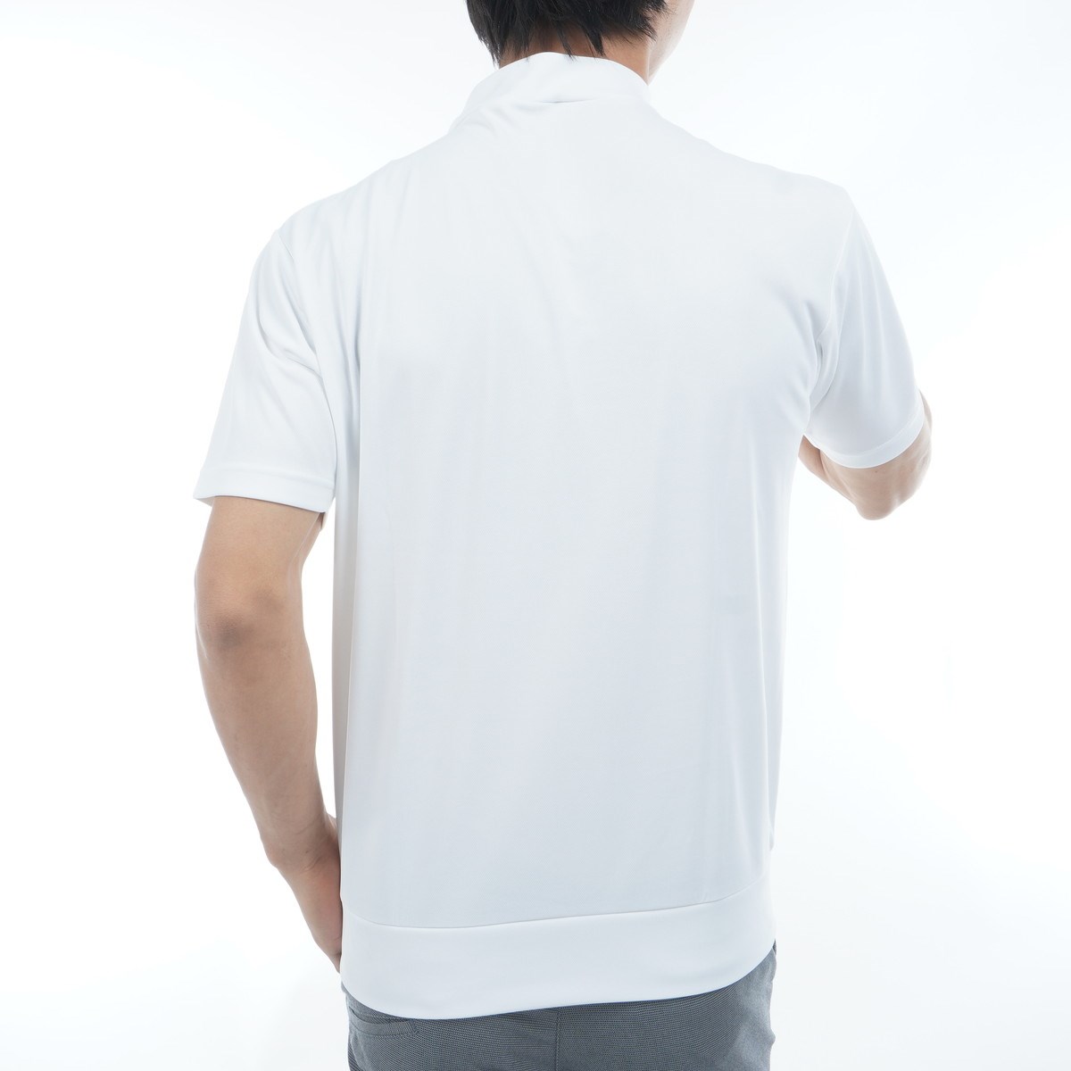 通気性に優れ、吸汗速乾機能、UVカット機能(UPF50+)、遮熱効果など、暑い季節に必要な要素を高い次元で実現した素材をボディと襟ともに使用した半袖モックネックシャツです。