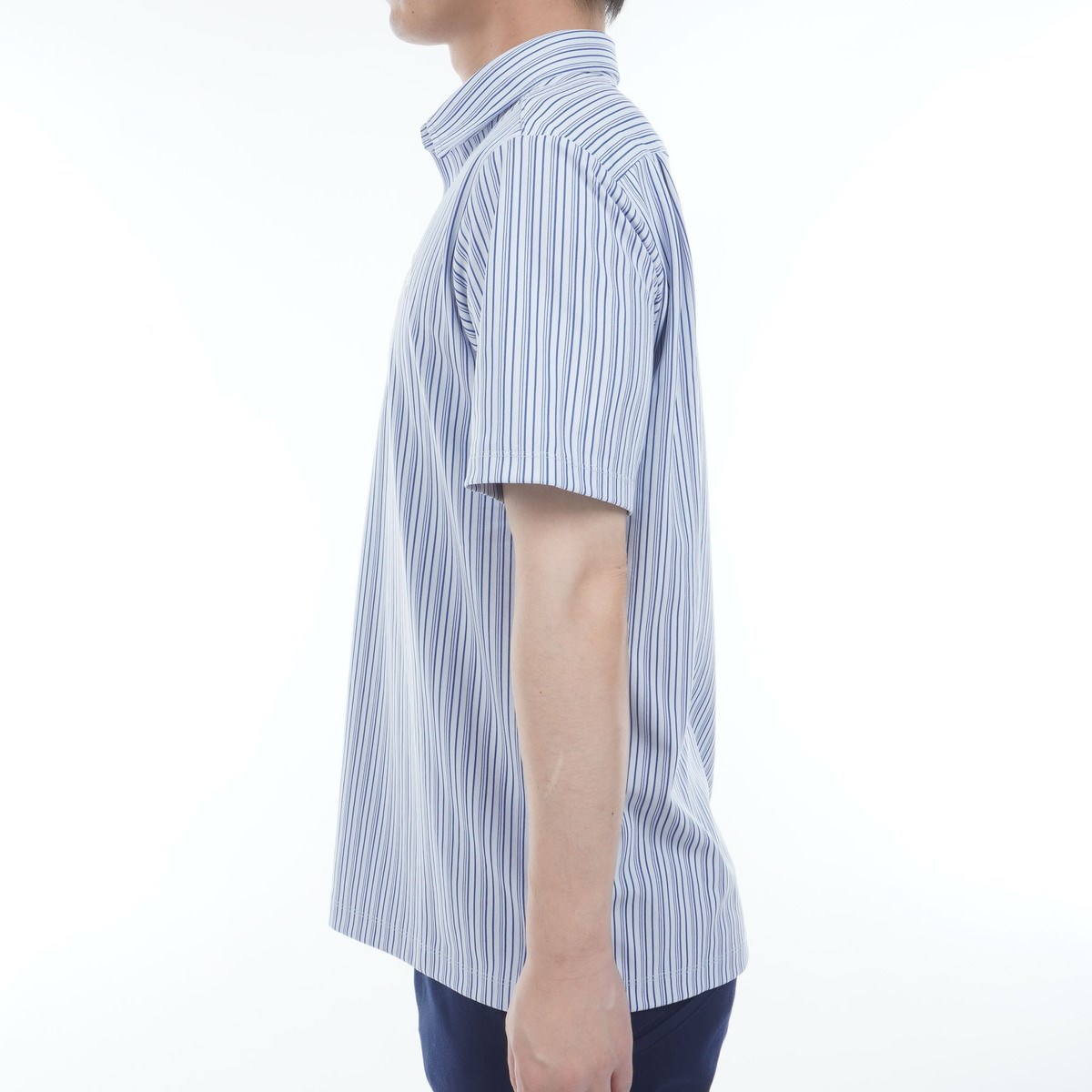 ジャカードでピッチ変化のあるストライプ柄と、表面の凸凹感を表現した、凝った素材の半袖ポロシャツです。