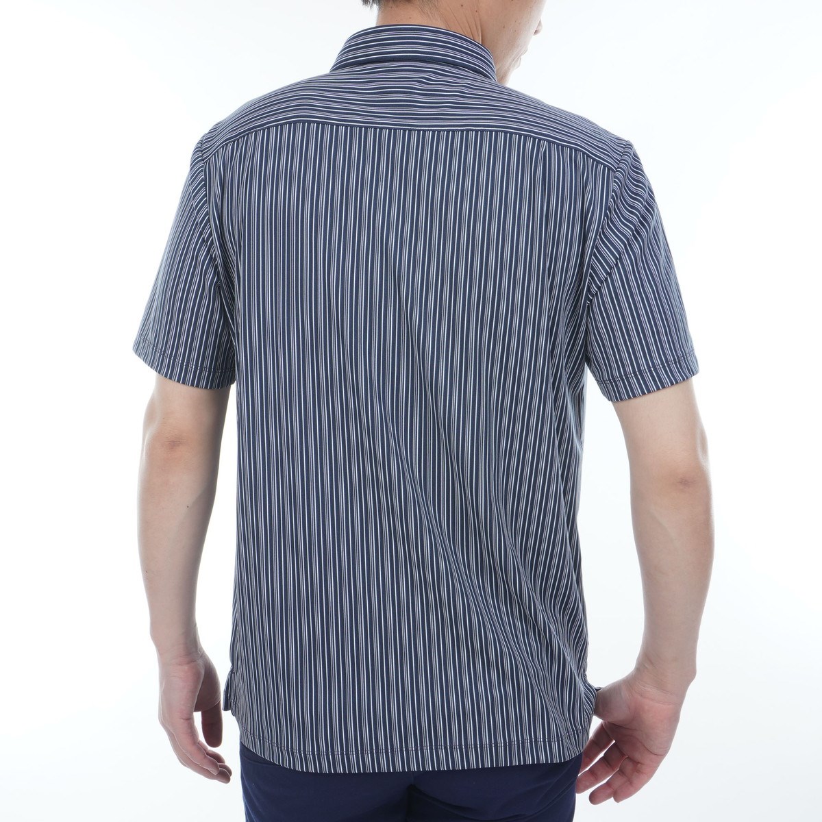 ジャカードでピッチ変化のあるストライプ柄と、表面の凸凹感を表現した、凝った素材の半袖ポロシャツです。