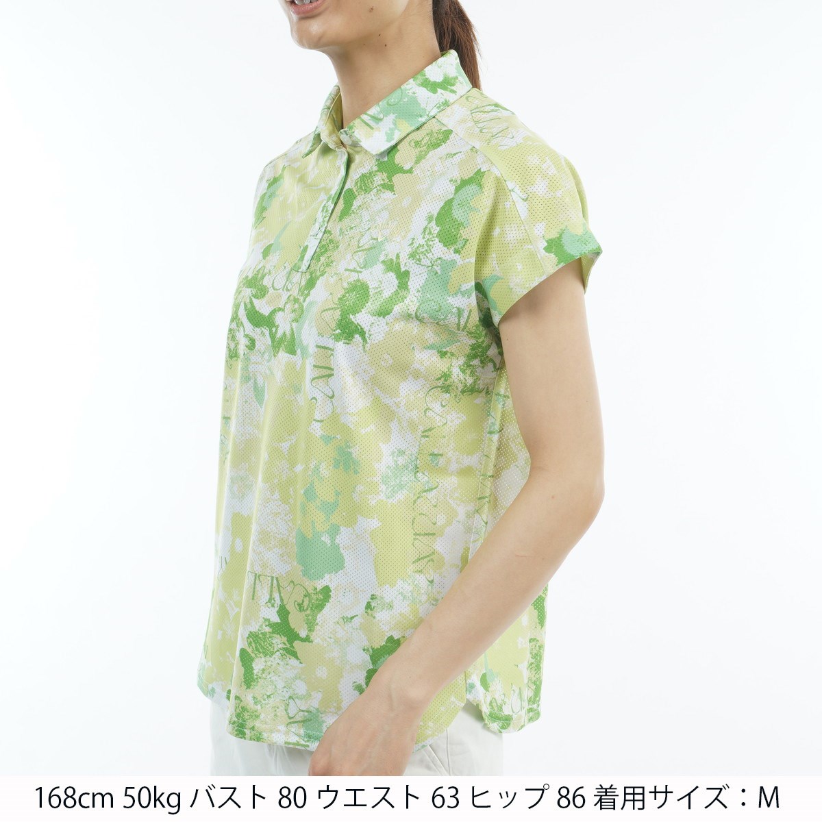 フレンチスリーブ風、身幅広めのリラックス感あるシルエットで夏のゴルフにおすすめのデザインシャツです。