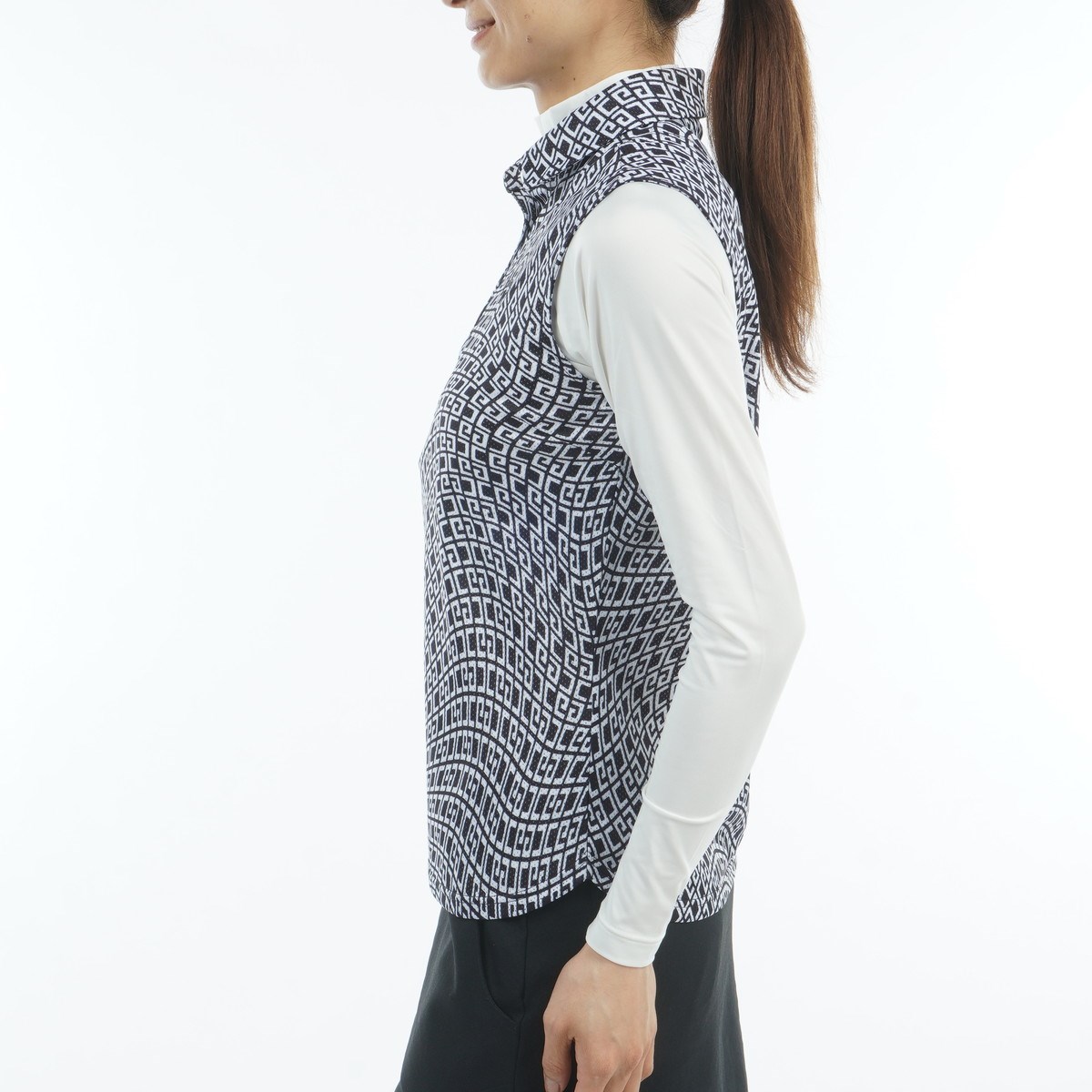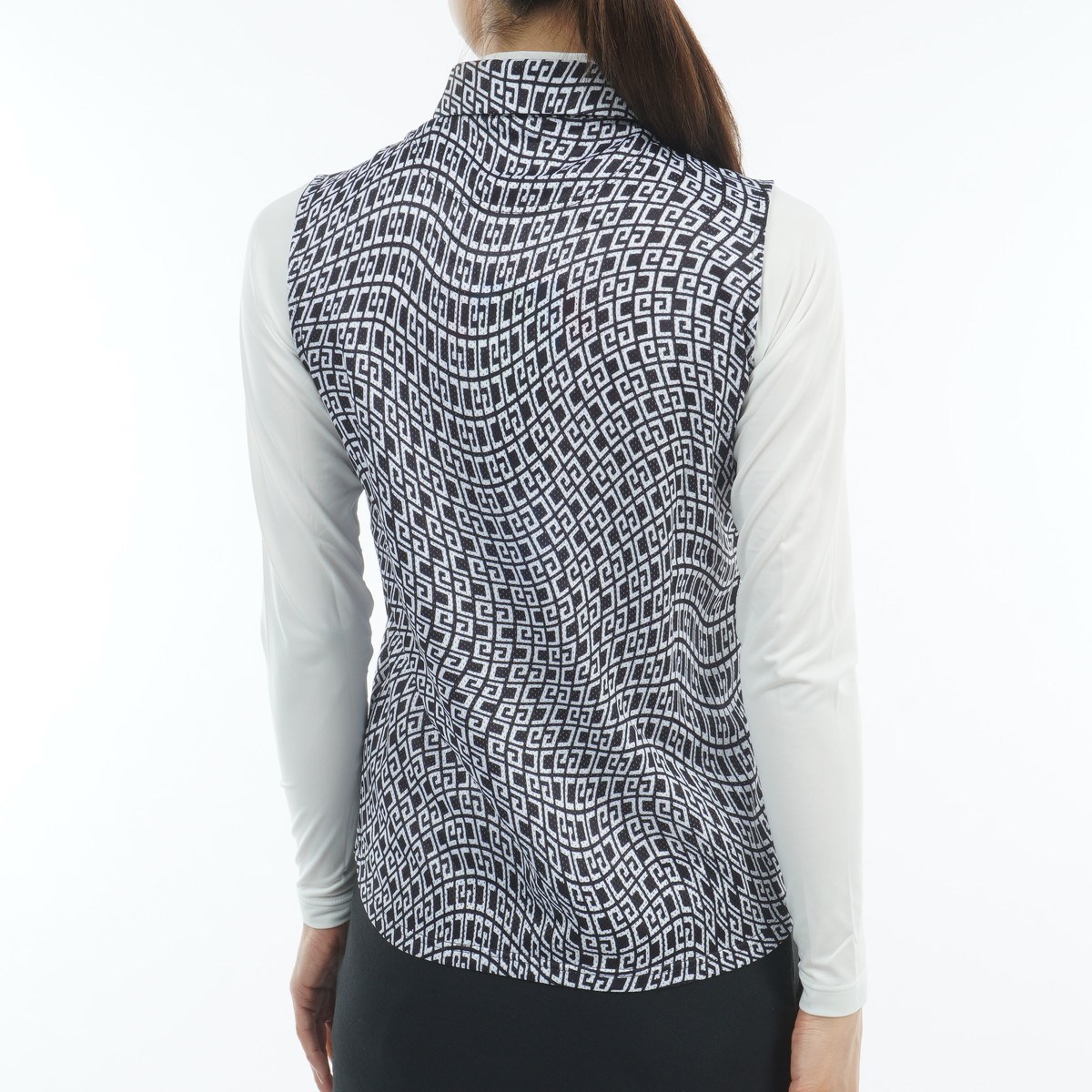配列したCGロゴにウェーブを効かせた柄がプリントされたスリーブレスポロシャツ。