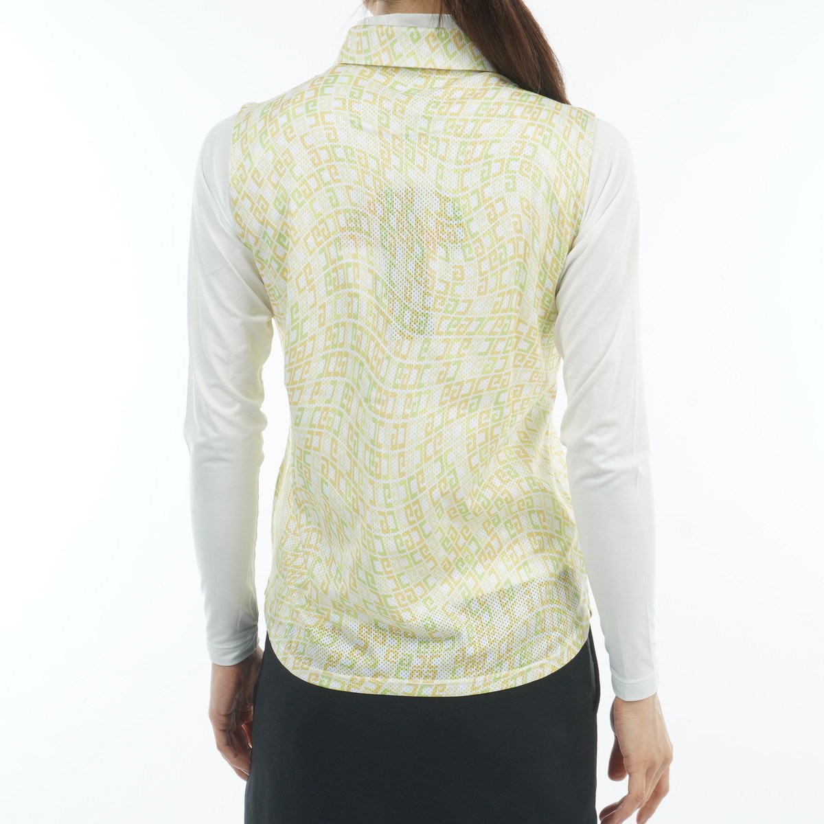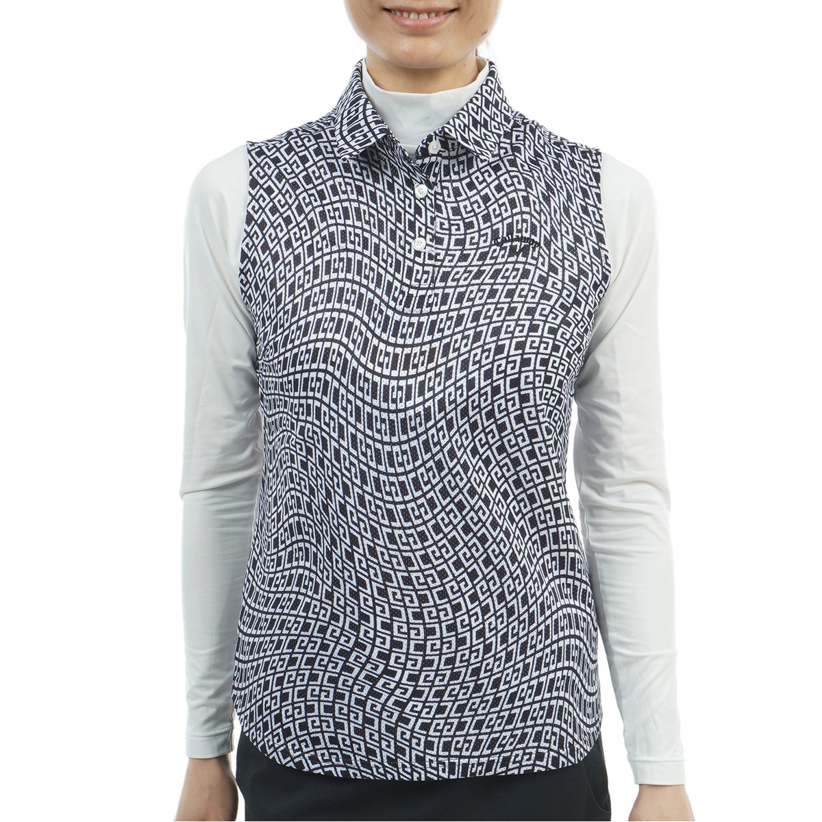 配列したCGロゴにウェーブを効かせた柄がプリントされたスリーブレスポロシャツ。