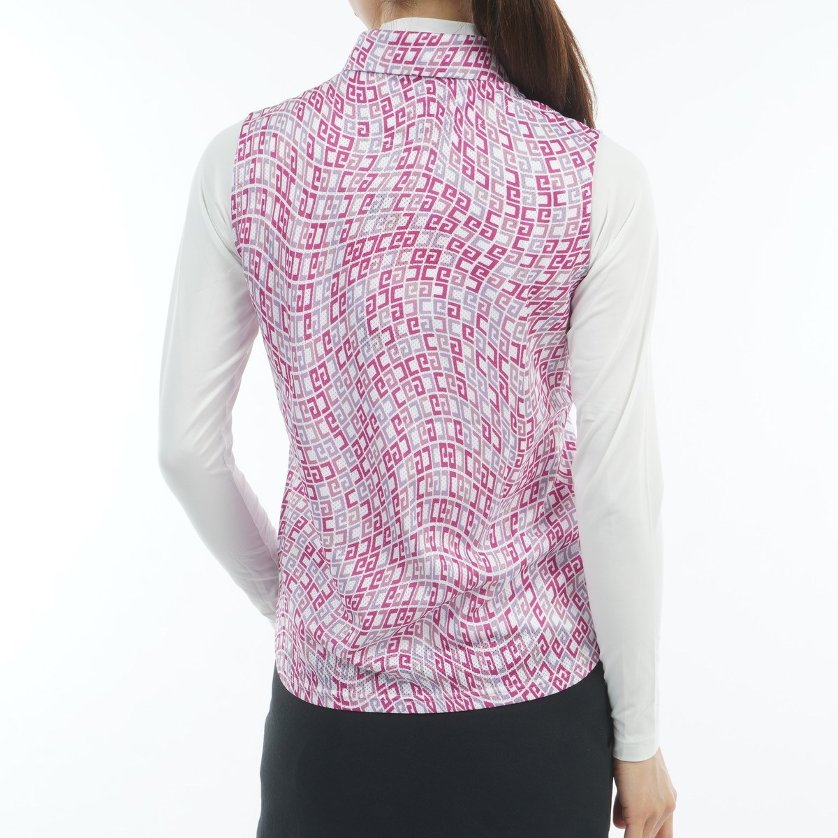 配列したCGロゴにウェーブを効かせた柄がプリントされたスリーブレスポロシャツ。