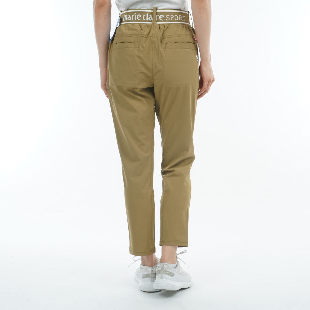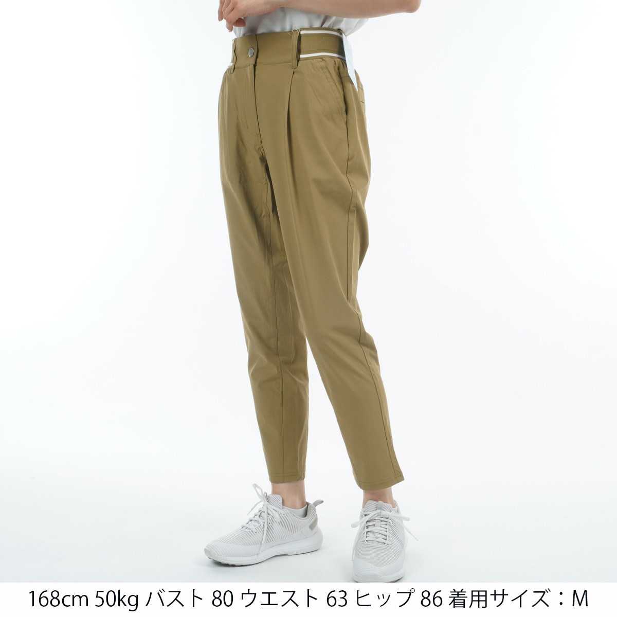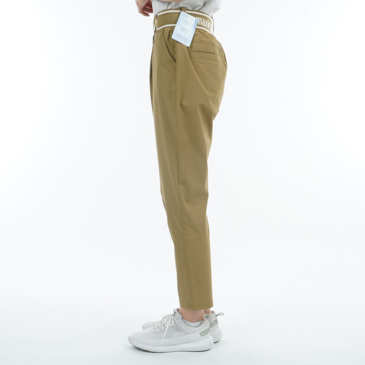 ロゴ入りのウエストリブお腹周りの窮屈感を軽減させ、フロントのタックがシャープな印象をもたらします。