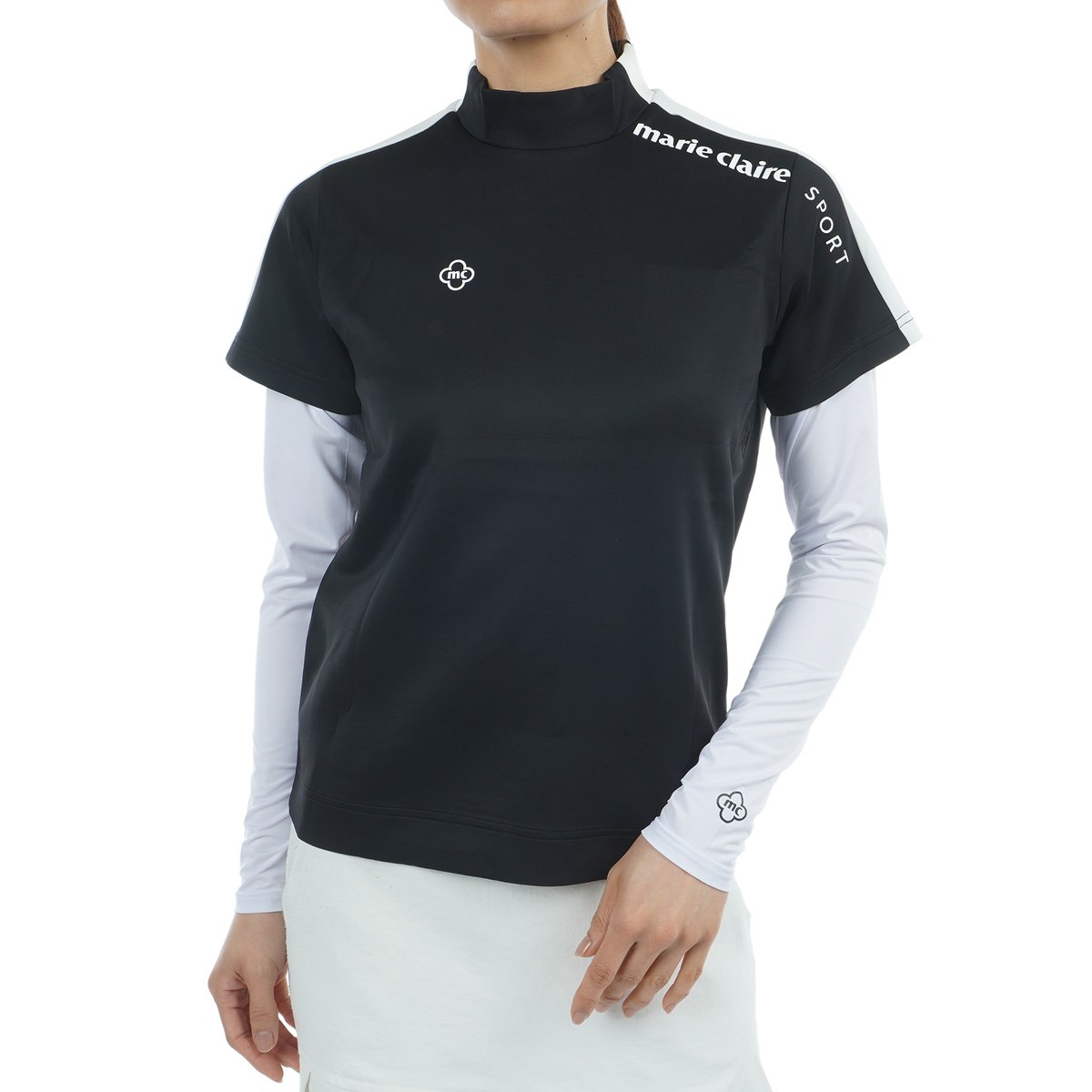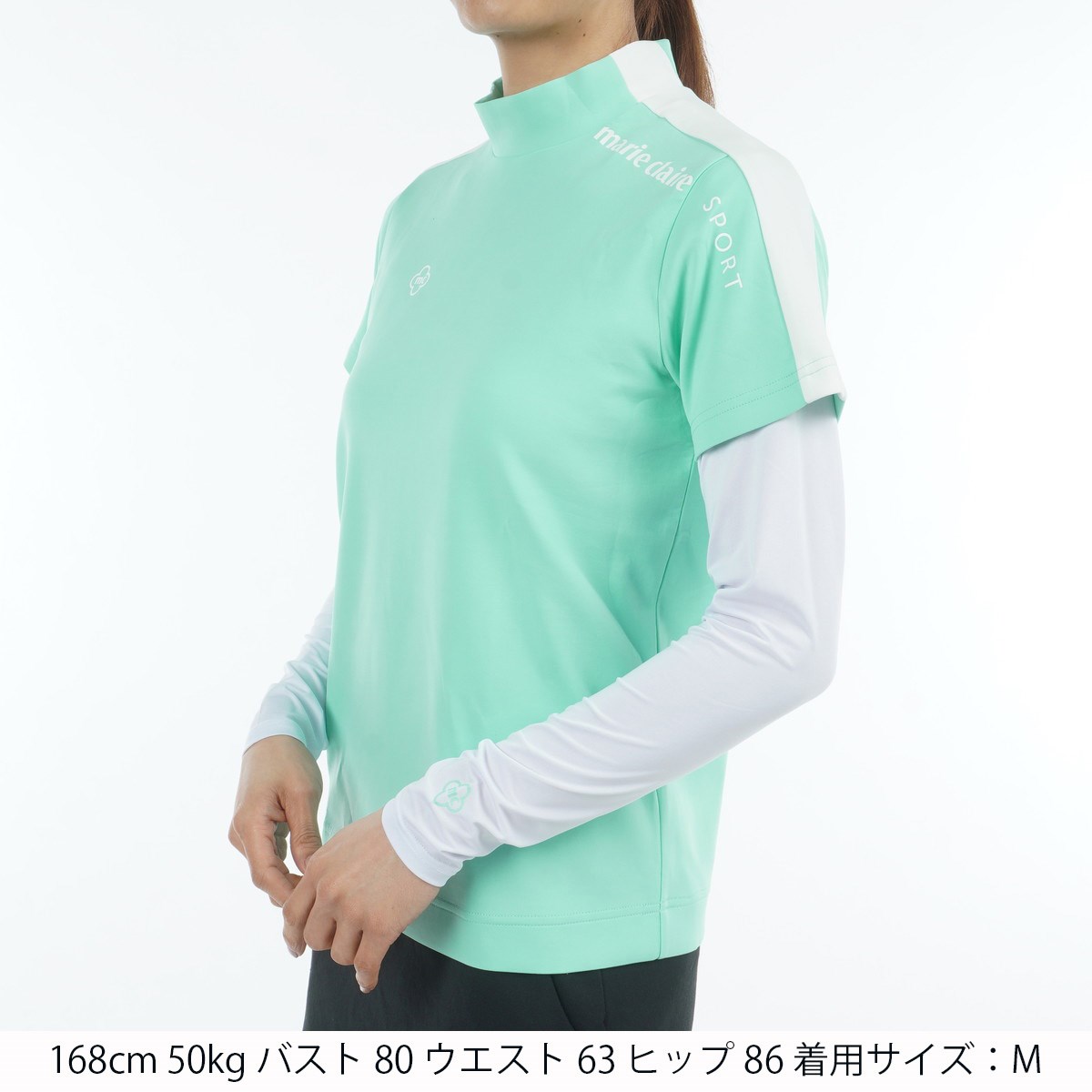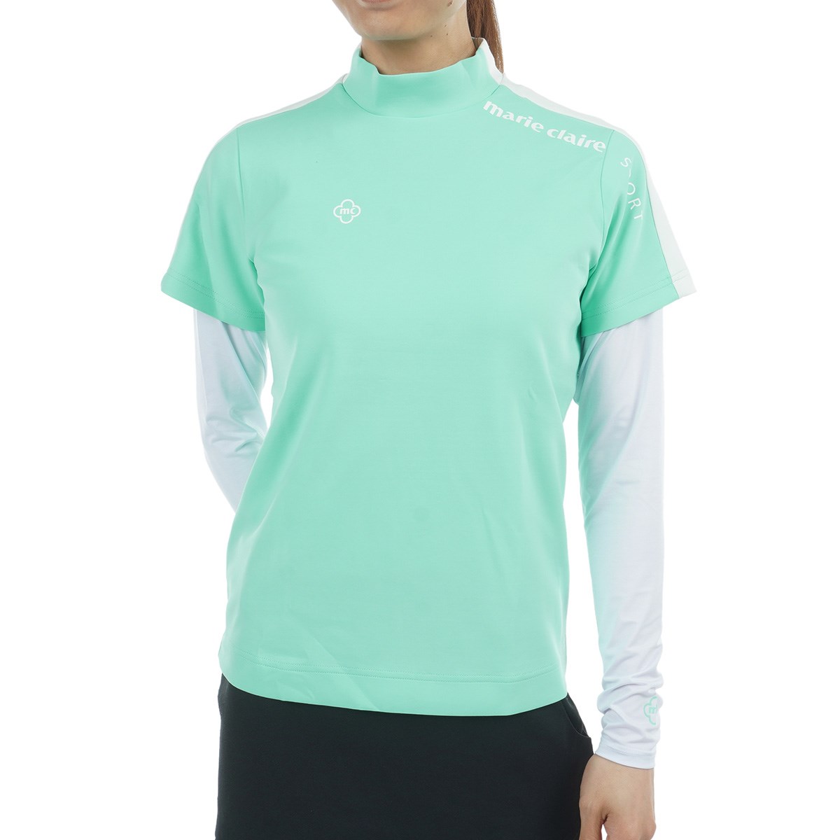 マリクレール marie claire ストレッチ 長袖インナーシャツ付きモックネック半袖シャツ L ブルー レディス