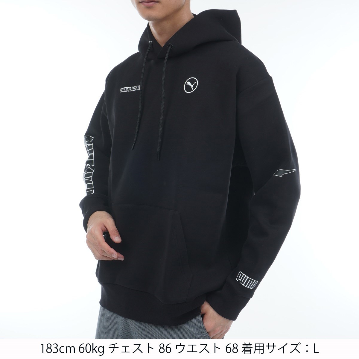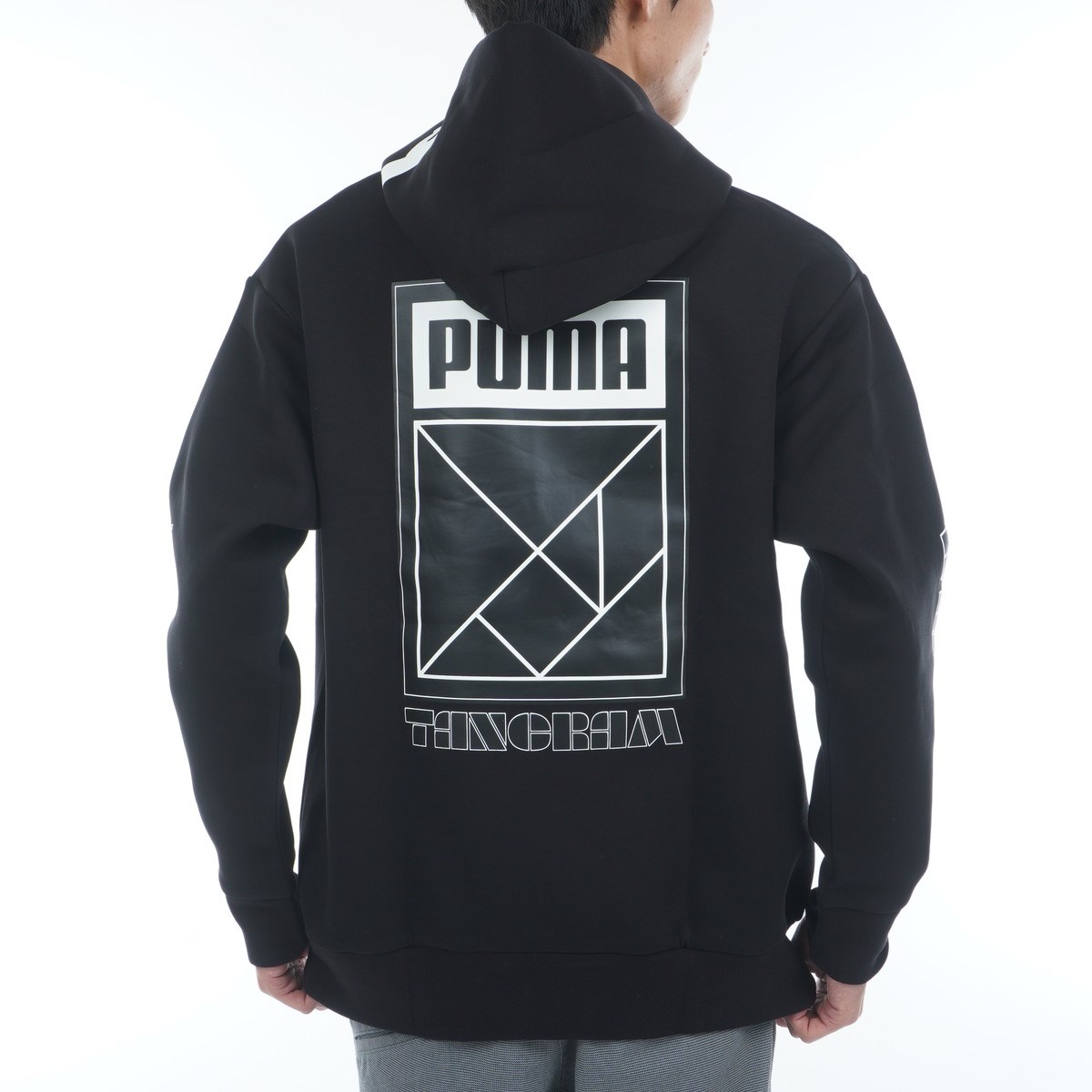 PUMAとTANGRAMのオリジナルロゴを身頃や袖にランダムに配したフーディー。