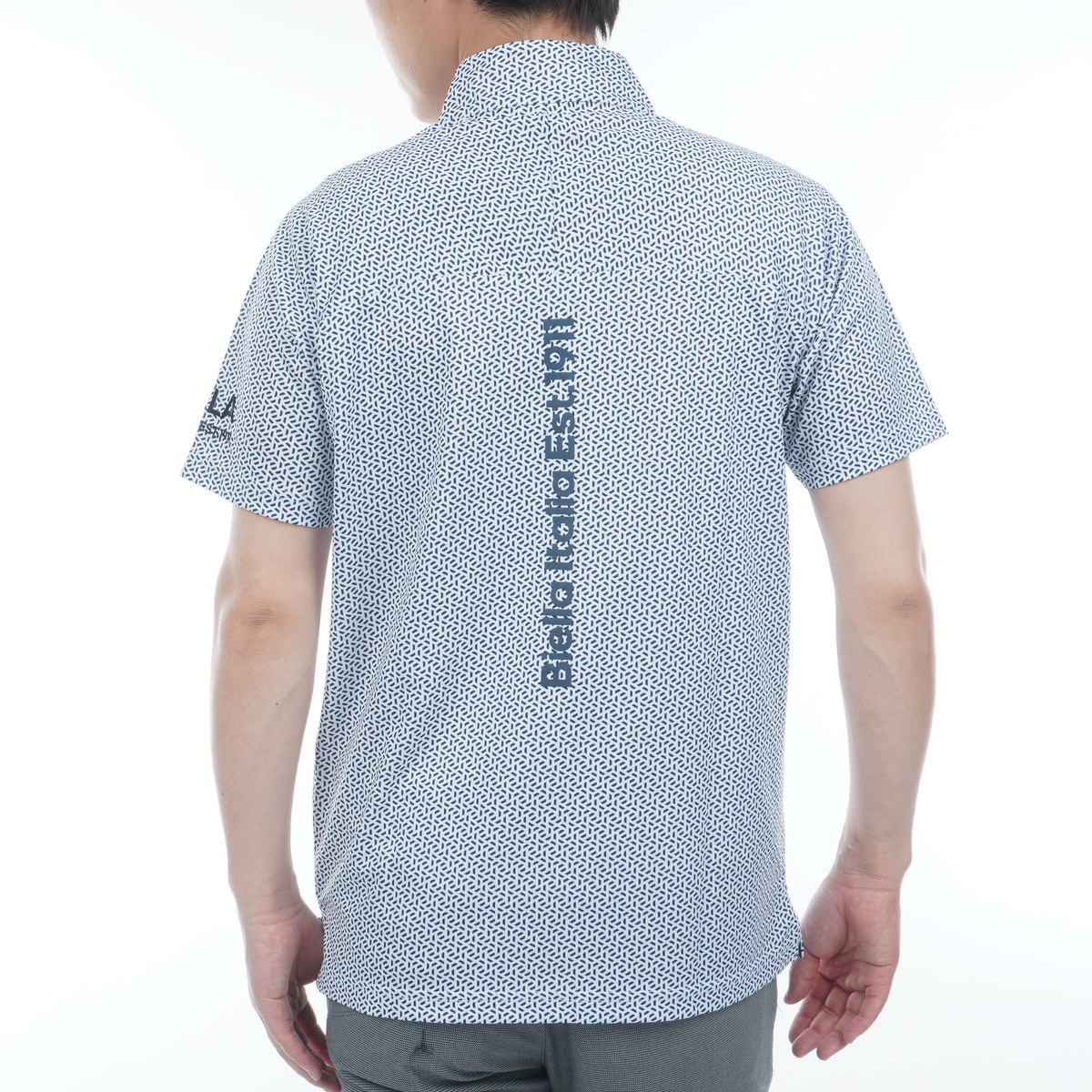 接触冷感・遮熱素材 小柄プリント ハーフジップ半袖シャツ。
