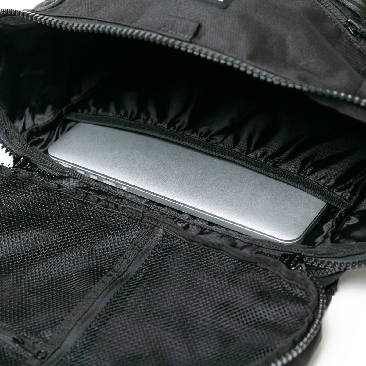 メイン収納の開口部を広めに設計し、両サイドに大型ポケットを配備。