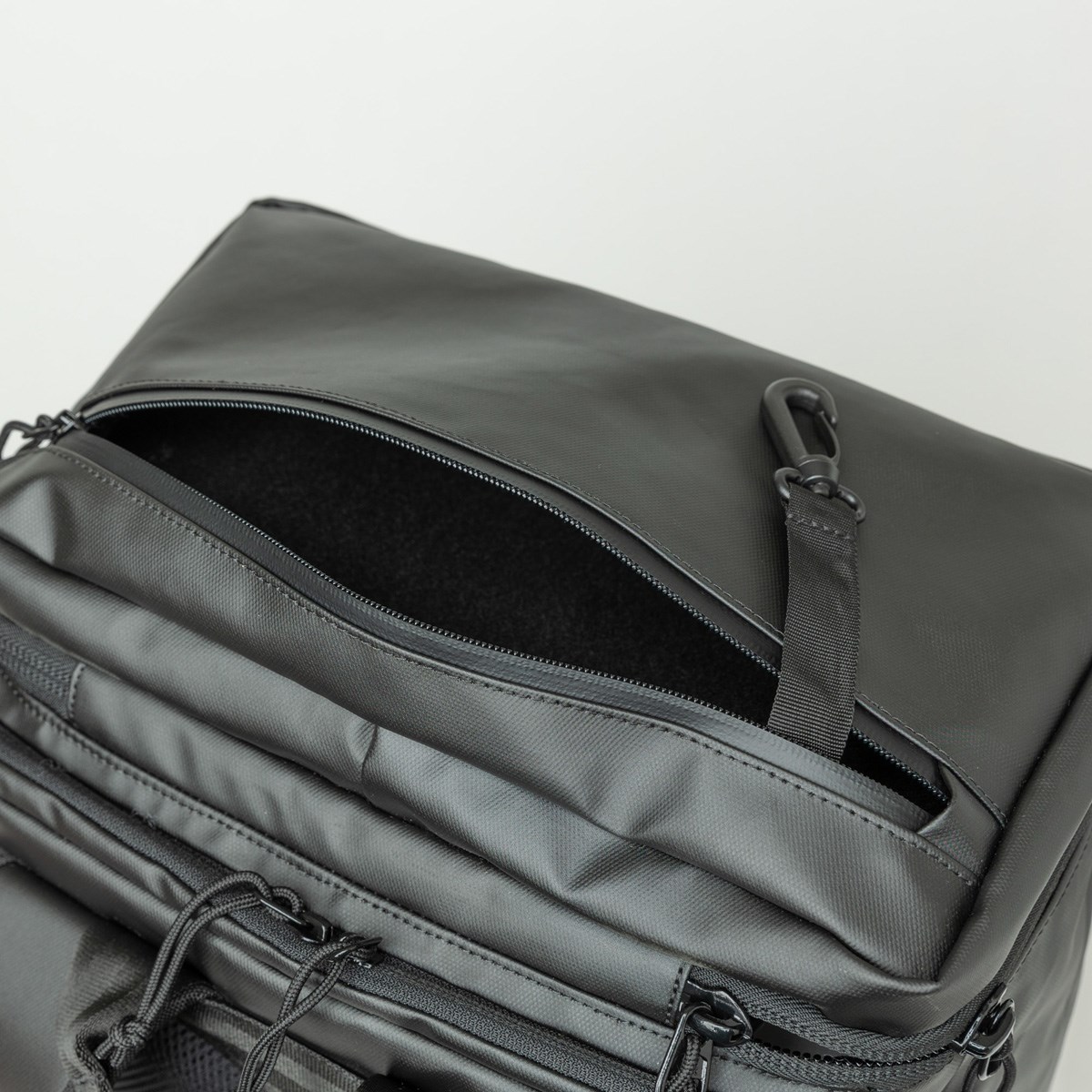 メイン収納の開口部を広めに設計し、両サイドに大型ポケットを配備。