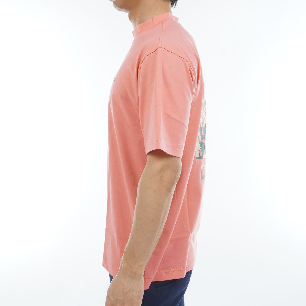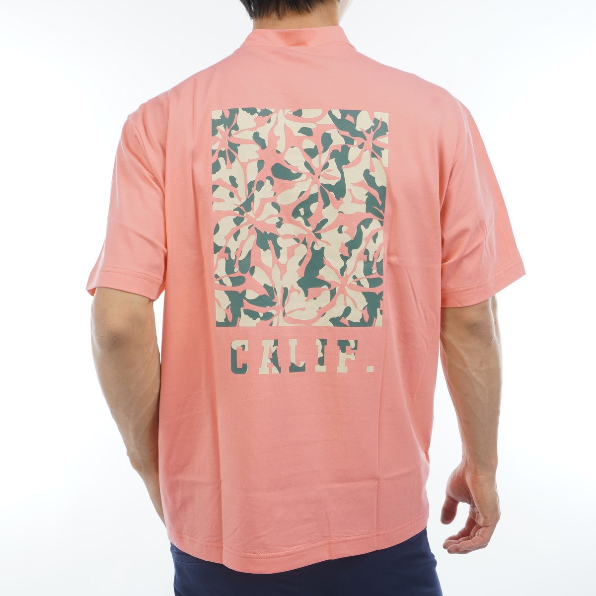 フラワー柄のバックプリントが特徴のモックネック半袖シャツは、接触冷感に優れたICEDFABRIC+という素材を使用したアイテムです。