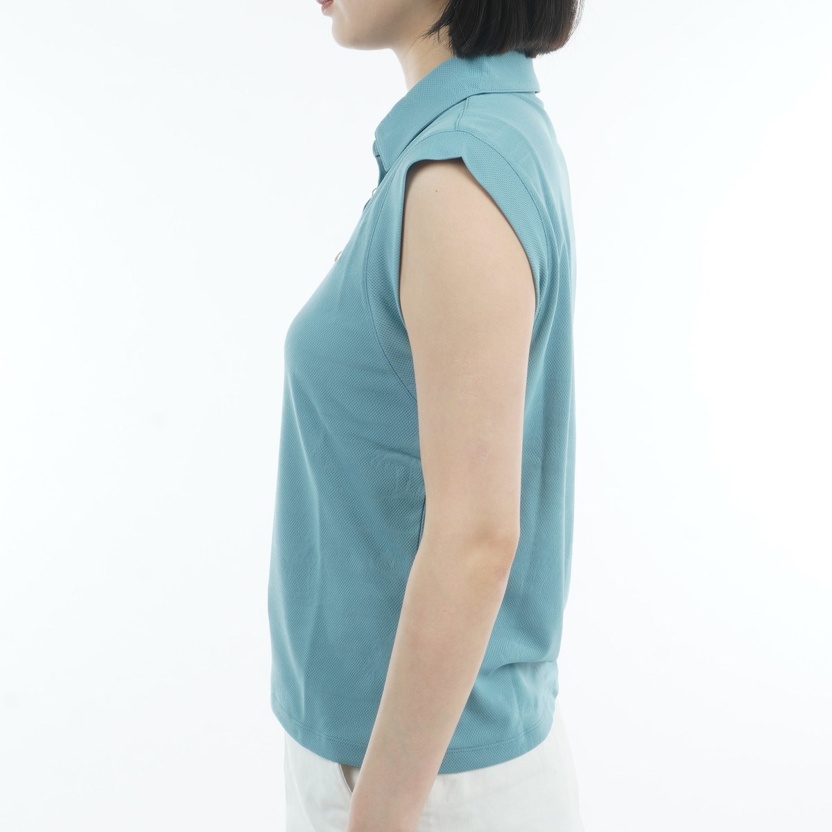 プチ袖が付いたノースリーブ風の型で、素材だけでなくシルエットやディーティールでも清涼感を訴求。