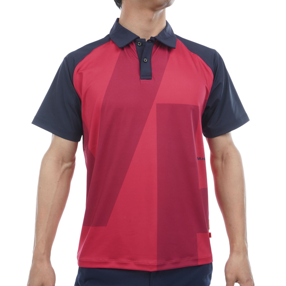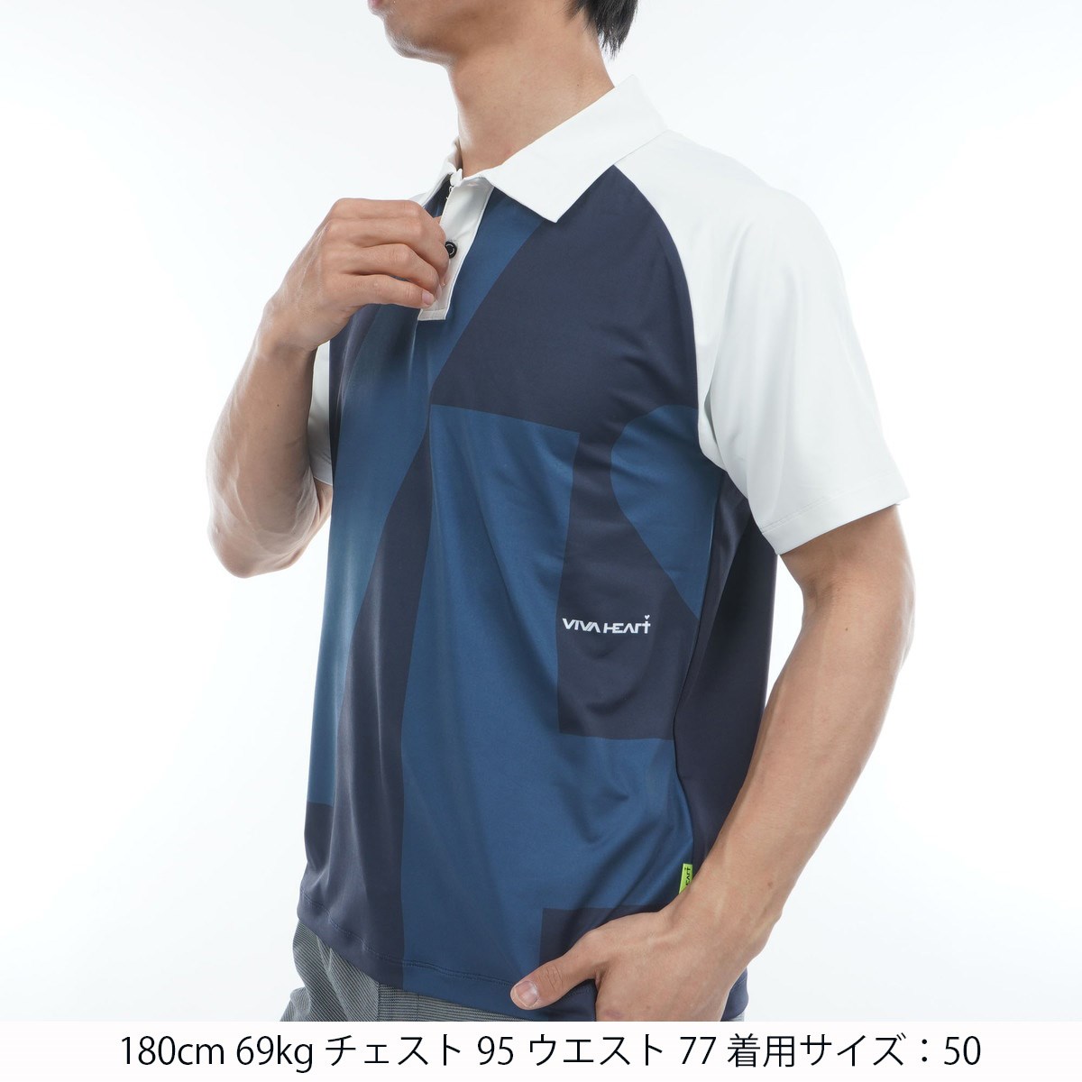 前身頃からはみ出す大きな「VIVA HAERT」のVHロゴグラフィックが入ったポロシャツ。
