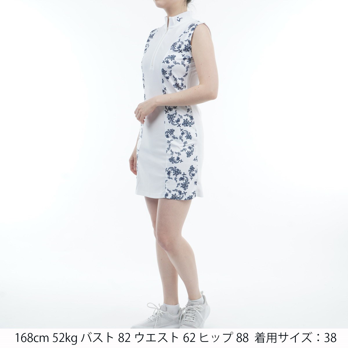 アンティーク茶器から着想を得たボタニカルプリントを大胆なパネルで施し、ウエスト周りを細くシェイプすることで美しい細見えシルエットを実現。