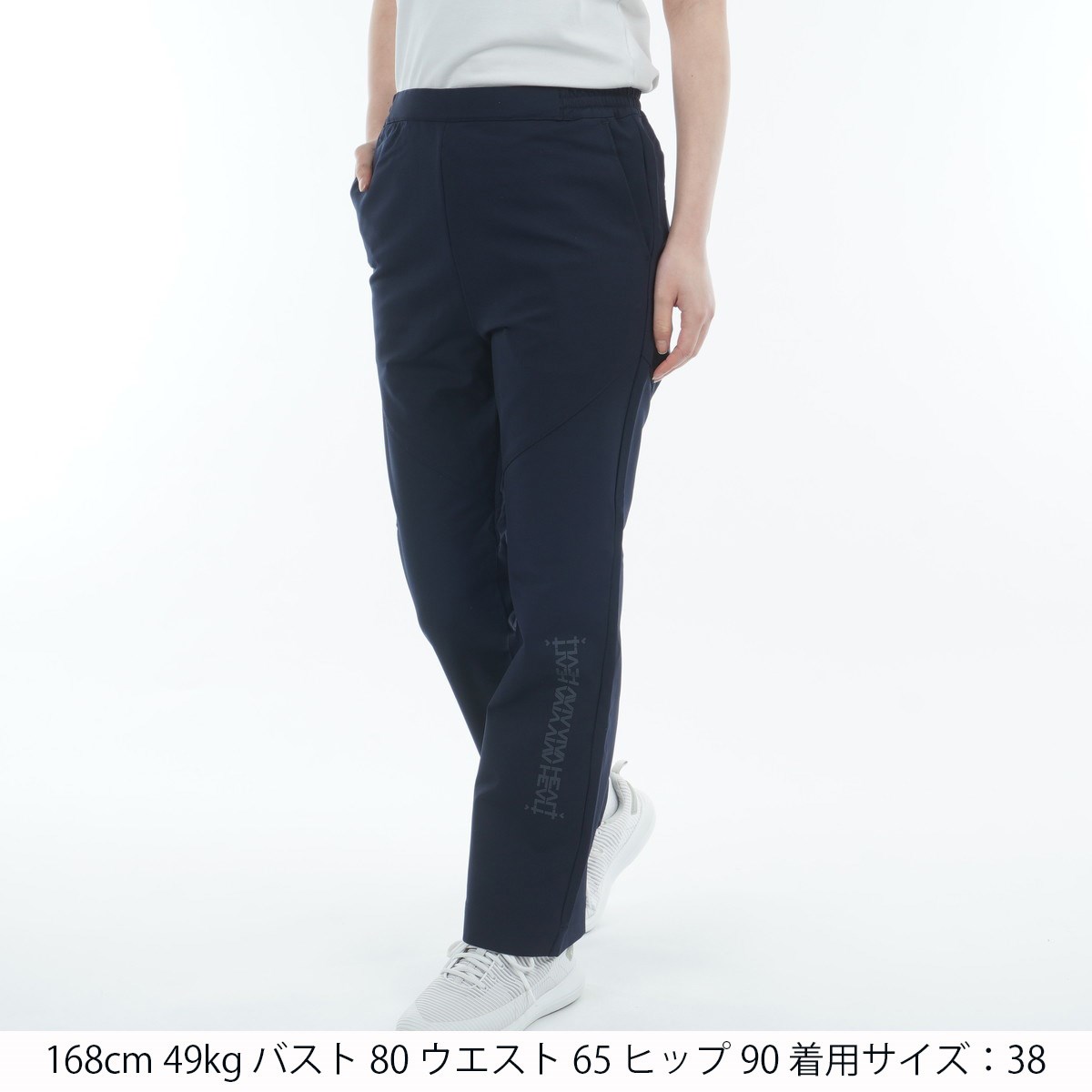 大胆ロゴが目を引く切替と、美脚ラインのシルエットを重視したデザインです。