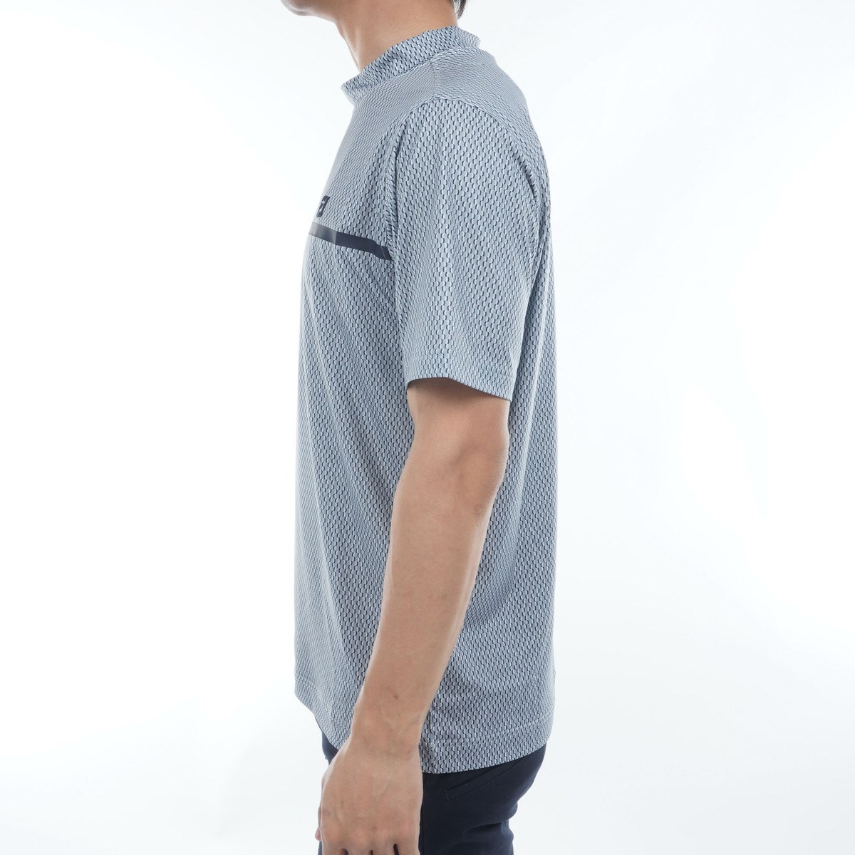 高ストレッチ素材を使用し快適な着心地と動きやすさを提供する半袖モックネックシャツ。