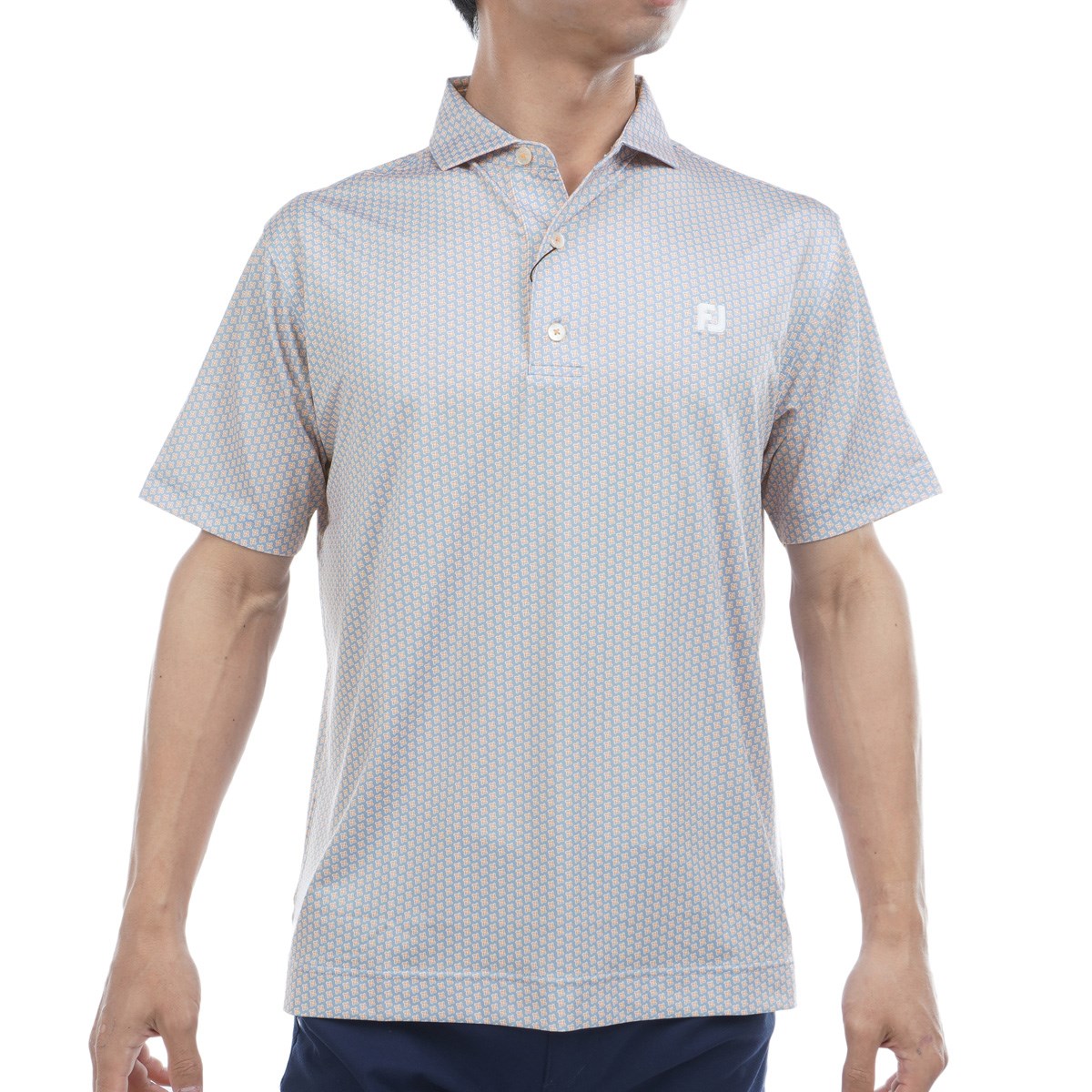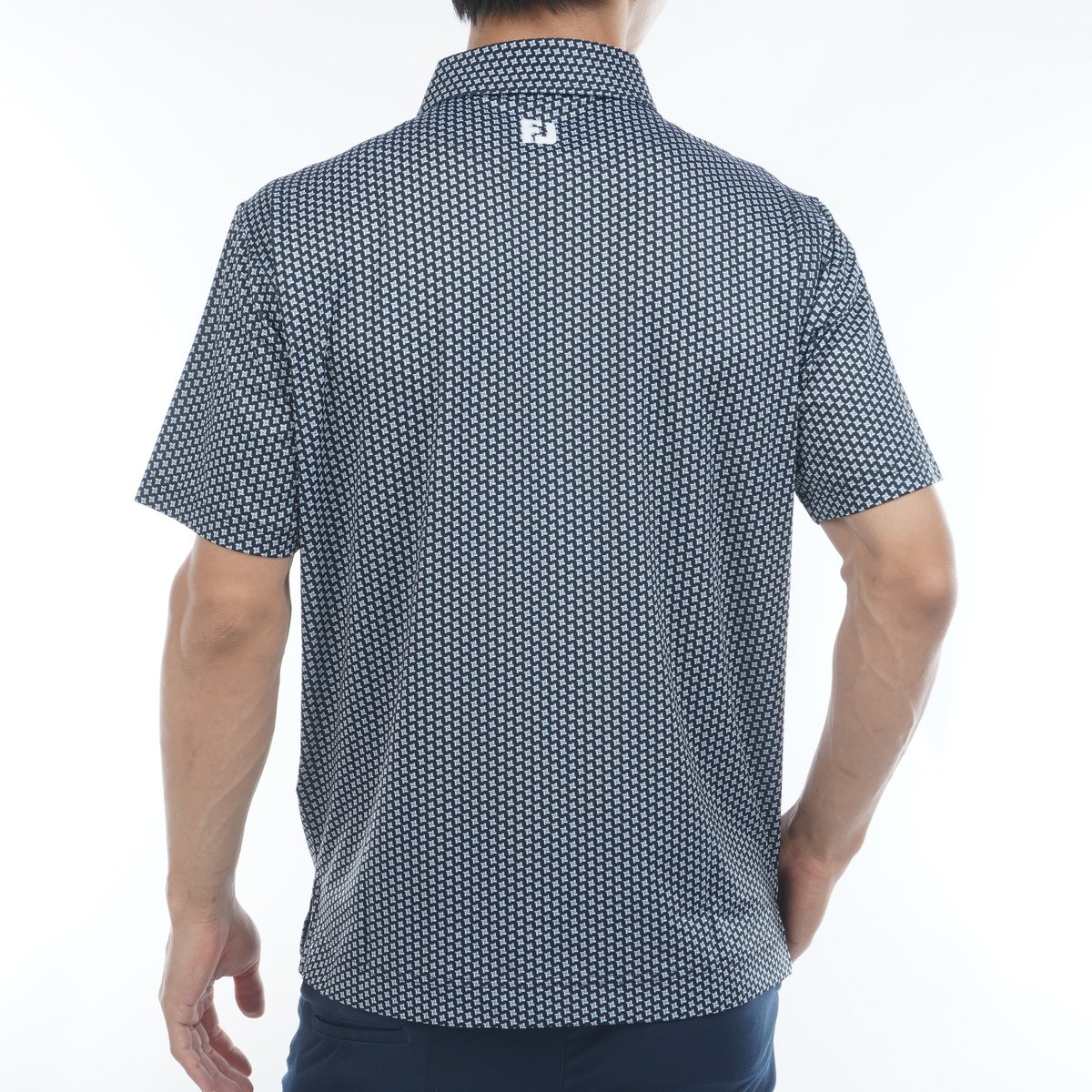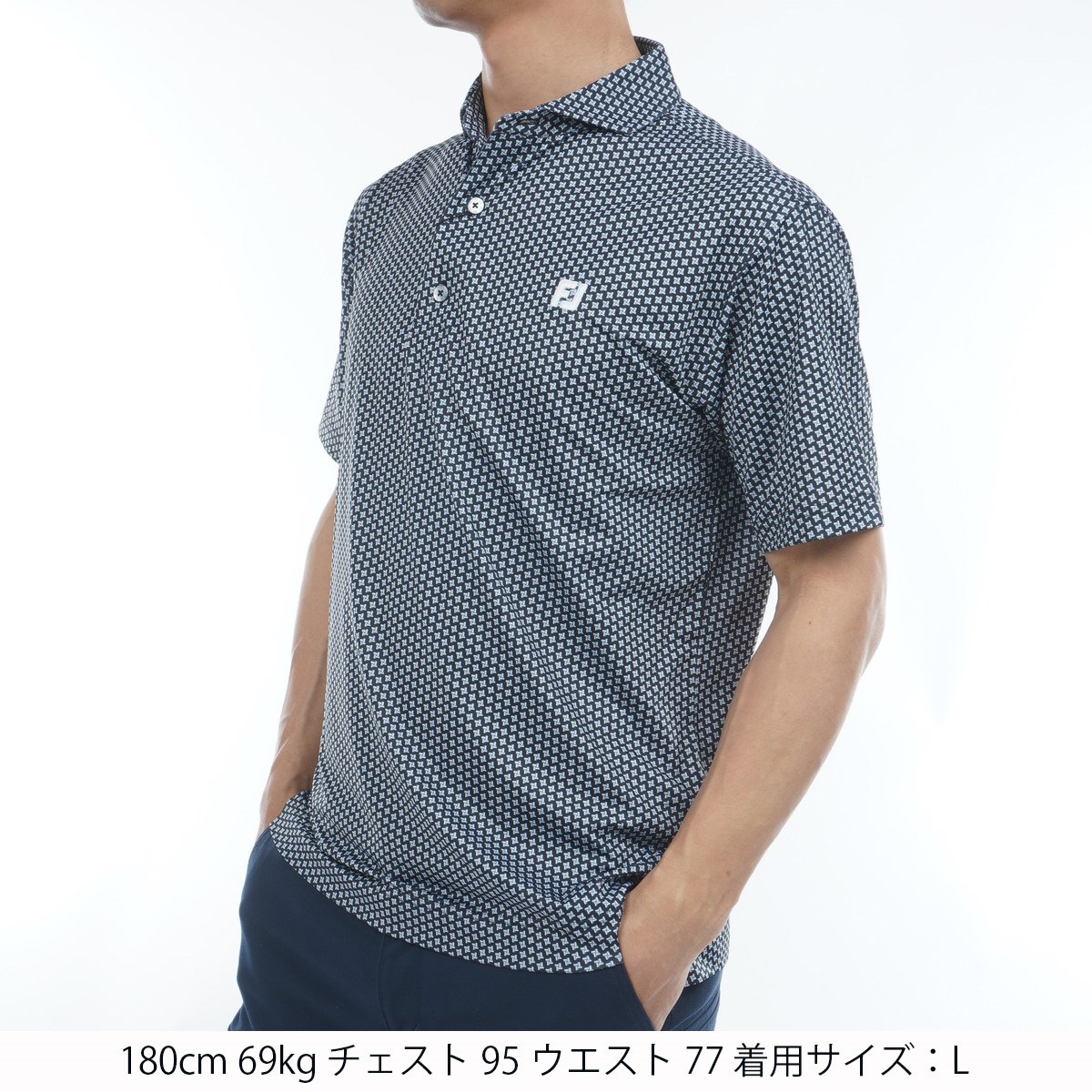 総柄ジオメトリックプリントがゴルフ場でインパクトを与え、ワイドカラーがスマートな首元を演出。