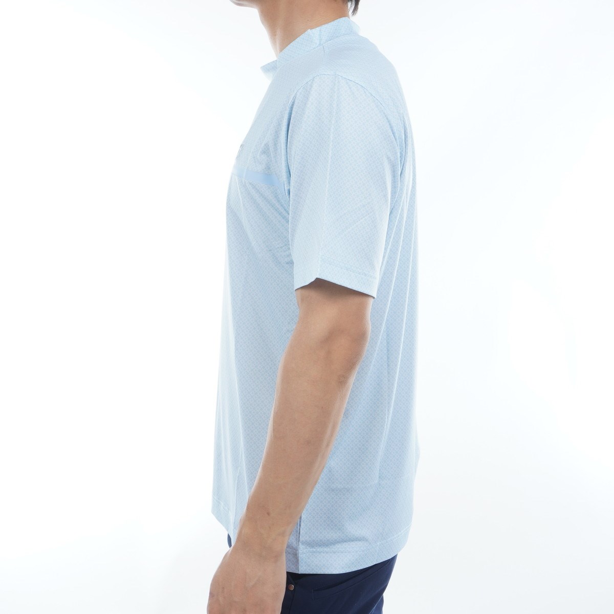 高ストレッチ素材を使用し快適な着心地と動きやすさを提供する半袖モックネックシャツ。