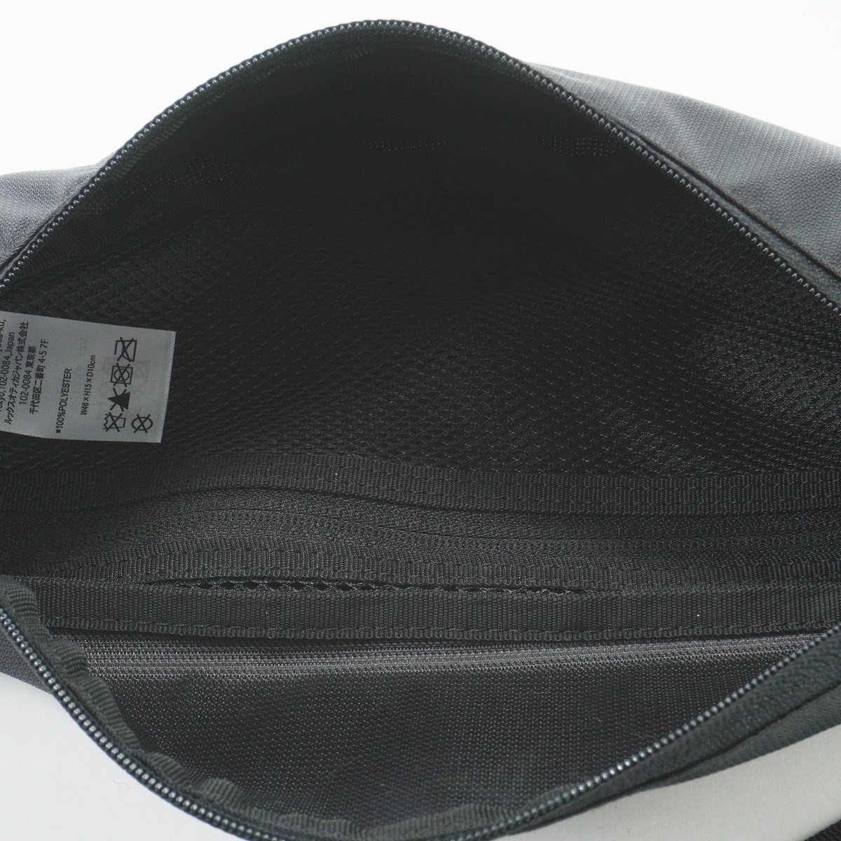撥水加工を施した耐久性のあるポリエステル素材を採用したウエストバッグ。