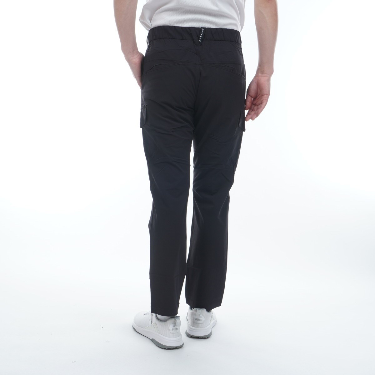 スタイリッシュに着用可能なシルエットで、右後ろベルトループにはDカンを付け利便性を考慮し、センターバックのベルトループを変形させて作ったロゴテープがデザインを引き立てる。